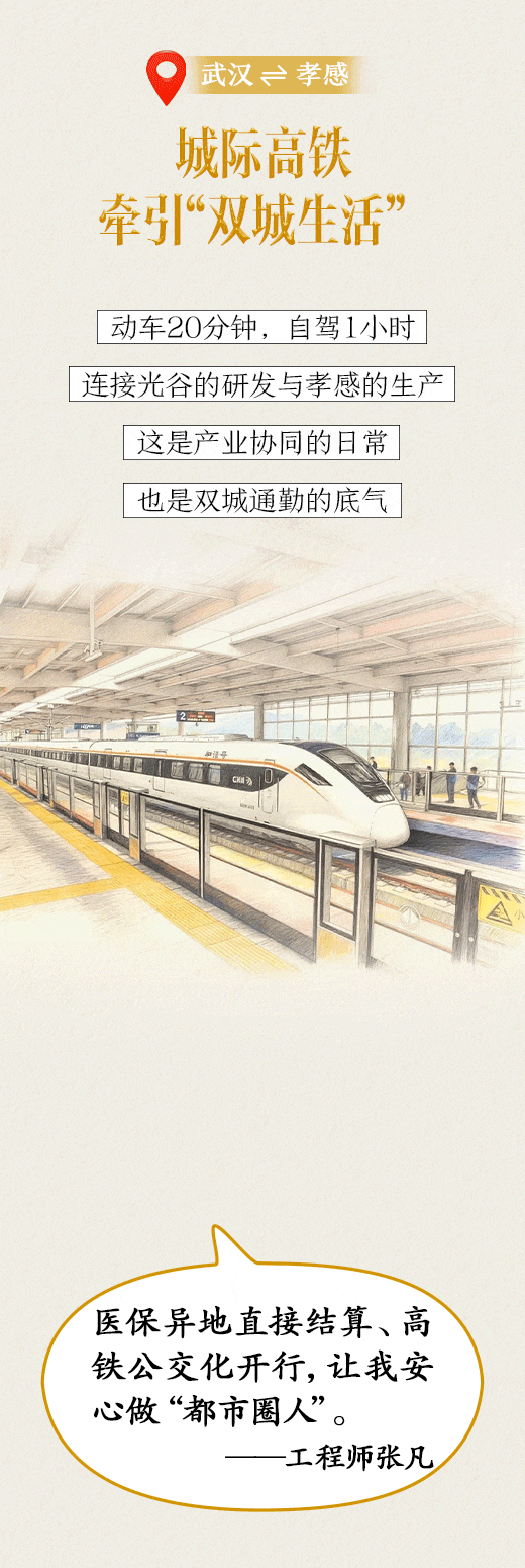 从在武汉工作、周末回咸宁的律师胡金琦,从依靠新城快线实现武汉黄石轻松通勤的王一,到研发在武汉、生产在孝感的工程师张凡;到借助地铁11号线在武汉与葛店之间来回穿梭的柳骏……在武汉都市圈蓬勃发展的当下,“双城生活”成为越来越多人的选择。