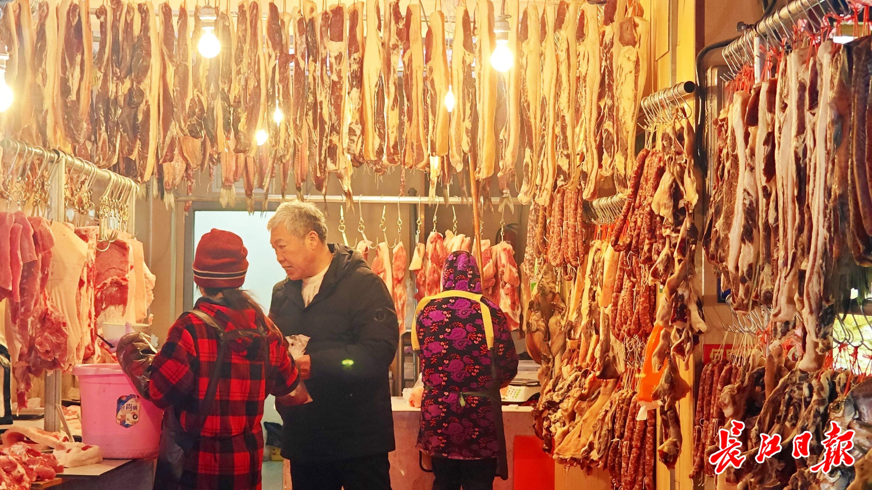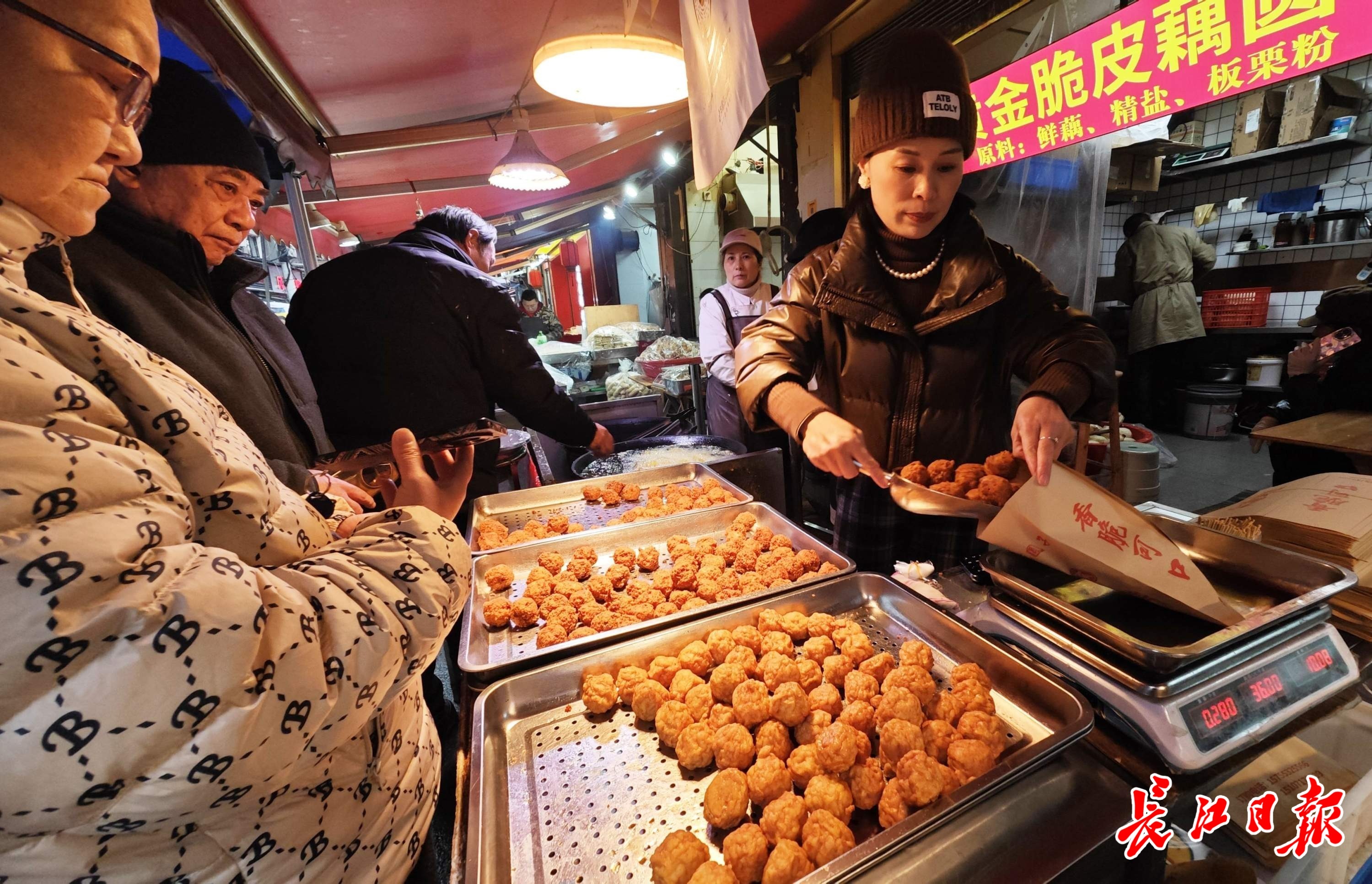 1月30日,虽然距离新春佳节还有半个多月时间,但江岸区的天声集贸市场里已经显得格外热闹。各种腊鱼腊肉、炸肉圆、新年装饰等销售都颇为火热,走在街头,让人感受到新年气氛扑面而来。