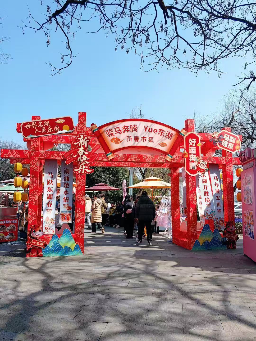 新春的东湖,传统民俗与市井烟火相映成趣,年味儿十足。东湖绿道湖光序曲广场新春市集火热开市,糖画、面人、剪纸等非遗技艺轮番亮相,文创好物、汉味小吃香气四溢;“东湖花里”年宵花市鲜花开箱,身着传统服饰的“卖花郎”穿行其间,传递新春雅趣。听涛景区内,猜灯谜、投壶、国风打卡等民俗互动体验轮番上线,红灯与黛瓦相映,处处洋溢着喜庆热闹的节日气息。