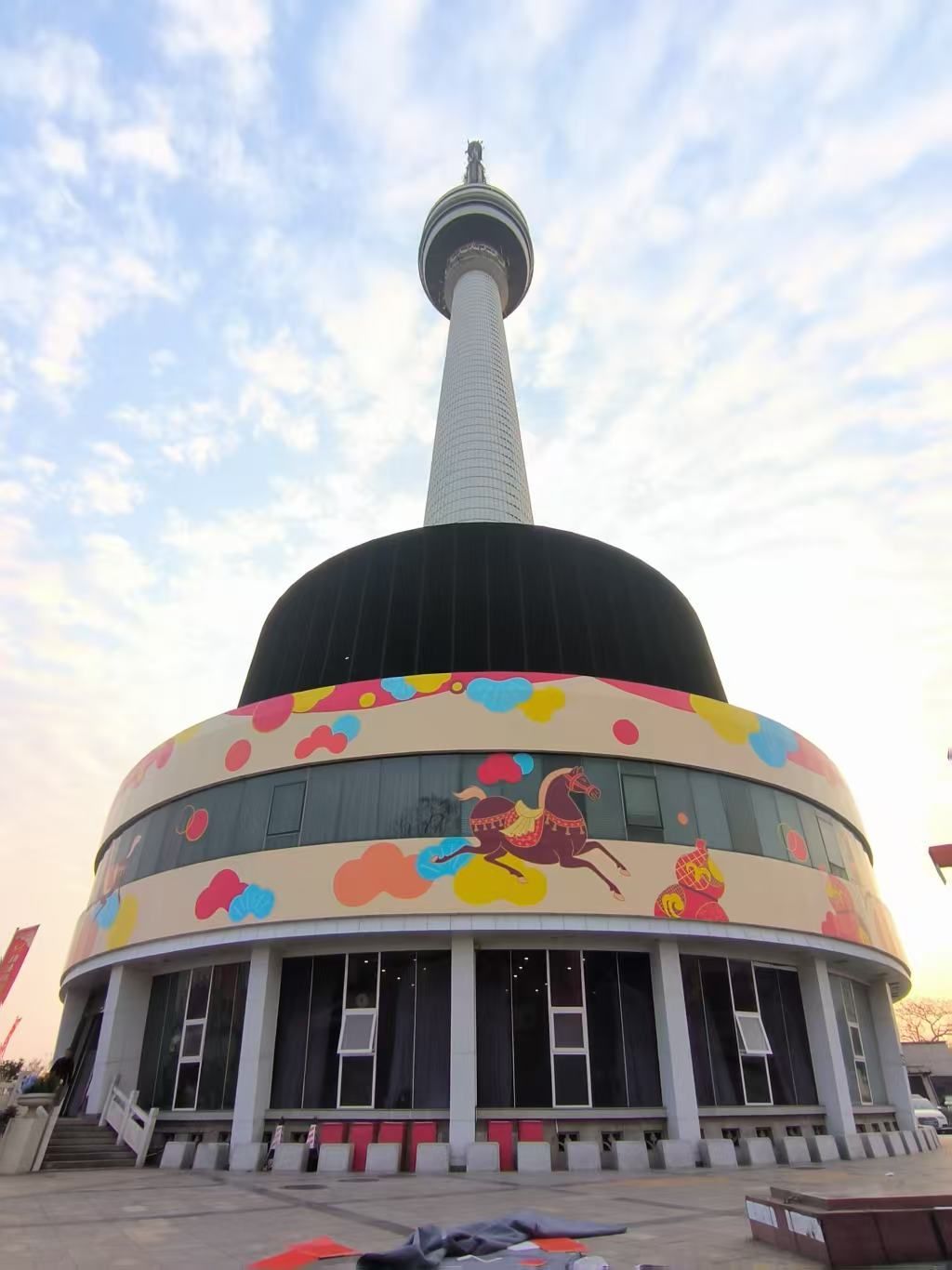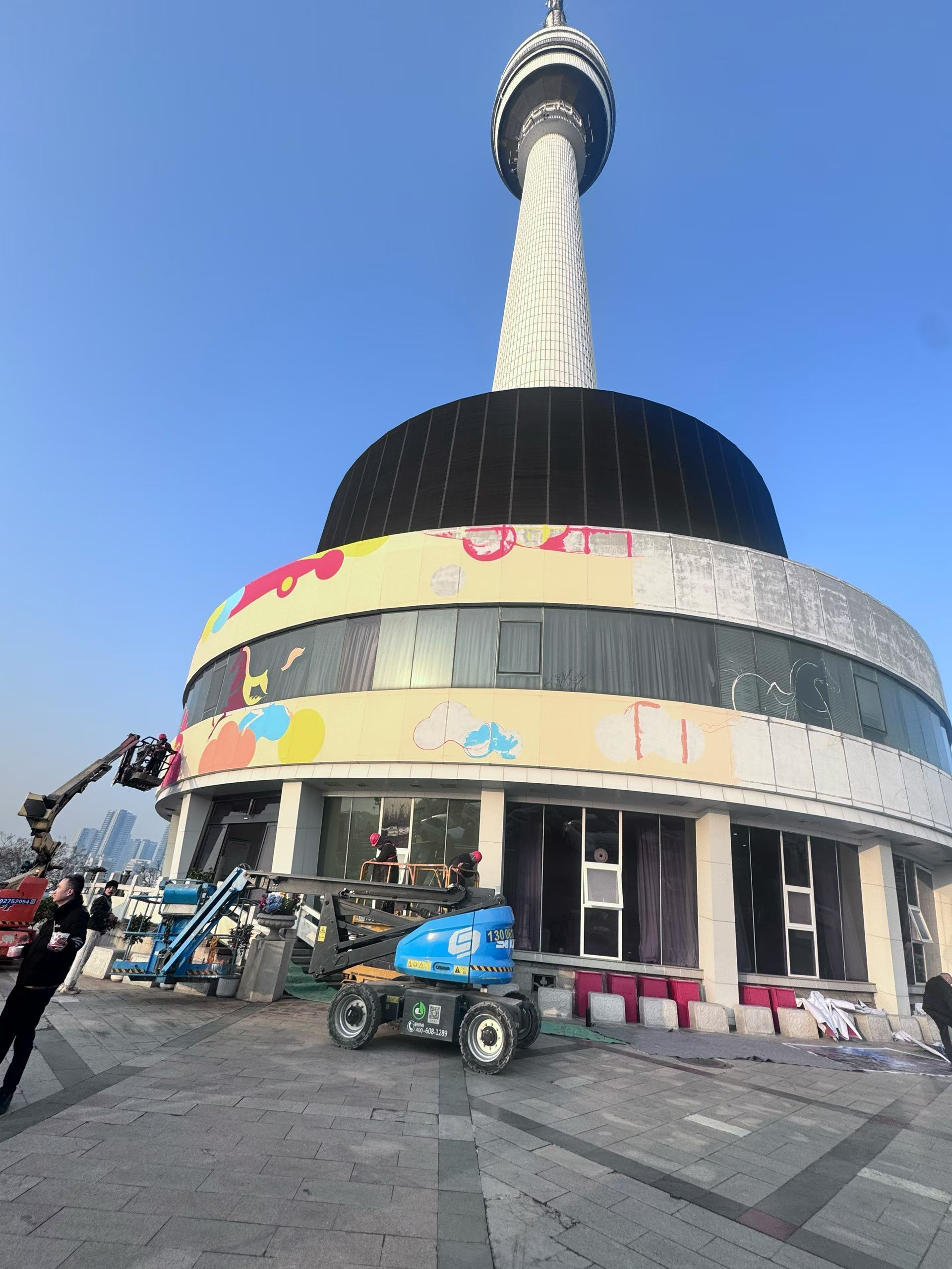 手绘团队以马年为主题,在仅有 1/5 设计图的基础上自主创作,用艺术笔触为这座城市地标注入新春活力。作为中国第一座自行设计施工的钢筋混凝土电视塔,龟山电视塔此次开放备受瞩目,塔底墙绘成为迎接游客的第一道视觉亮点。据手绘团队成员胡佳飞介绍,项目于2月10日开工,6名画师分乘4台高空作业车,每日清晨七点半顶着水雾开工,奋战至晚间7点,历时10小时完成创作。“塔体外围是铝扣板与玻璃结合的特殊材质,我们先精心打底处理,再反复调试涂料确保颜色统一,光色彩校准就做了3遍。” 胡佳飞透露,由于仅正面有设计初稿,团队需延续原有风格完成整圈构图,最终将初稿的2匹马扩展为8匹,寓意“马到成功、八方来财”。