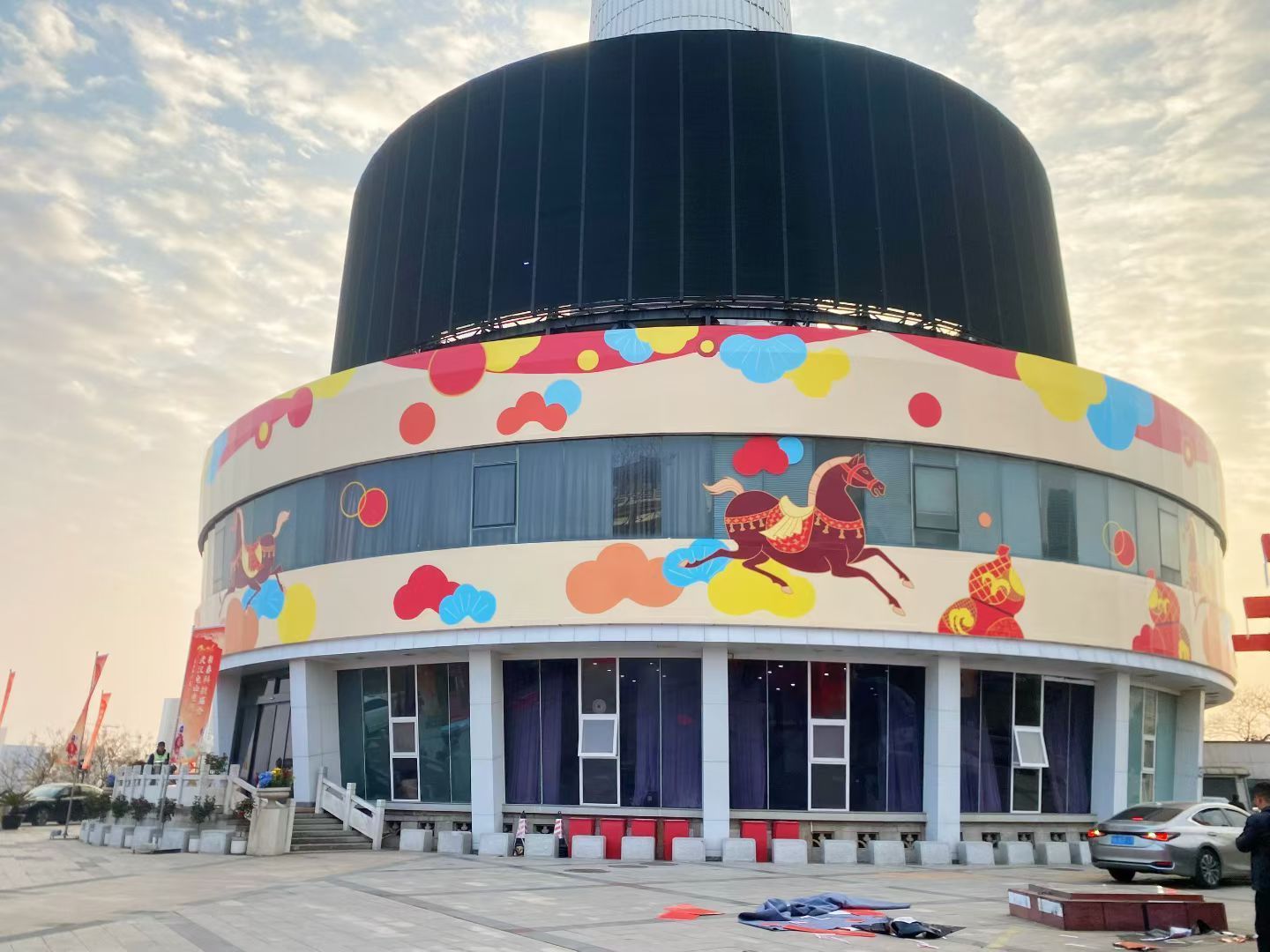 此次墙绘创作面临多重挑战:圆形塔身需精准把控整体构图连贯性,高空作业需兼顾效率与安全,玻璃与铁皮材质的色彩融合更是考验技术。“不同于普通墙面,玻璃上的颜料附着力要求更高,且要与铝扣板上的图案无缝衔接。” 胡佳飞告诉记者,尽管作业区域人车通行频繁,但通过合理规划施工时段,最终提前完成900平方米的绘制任务,如果不再更换墙绘,作品预计可稳定保存两年。