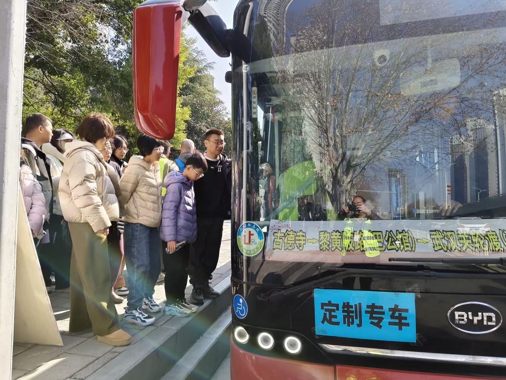 2月21日(大年初五)上午10时,在网红景点工农兵路古德寺门外,D112路起点站排起了长队。车头标识醒目,线路串联山海关路、黎黄陂路、武汉关轮渡、晴川阁等景点。公交工作人员现场引导,帮助游客扫码、购票。