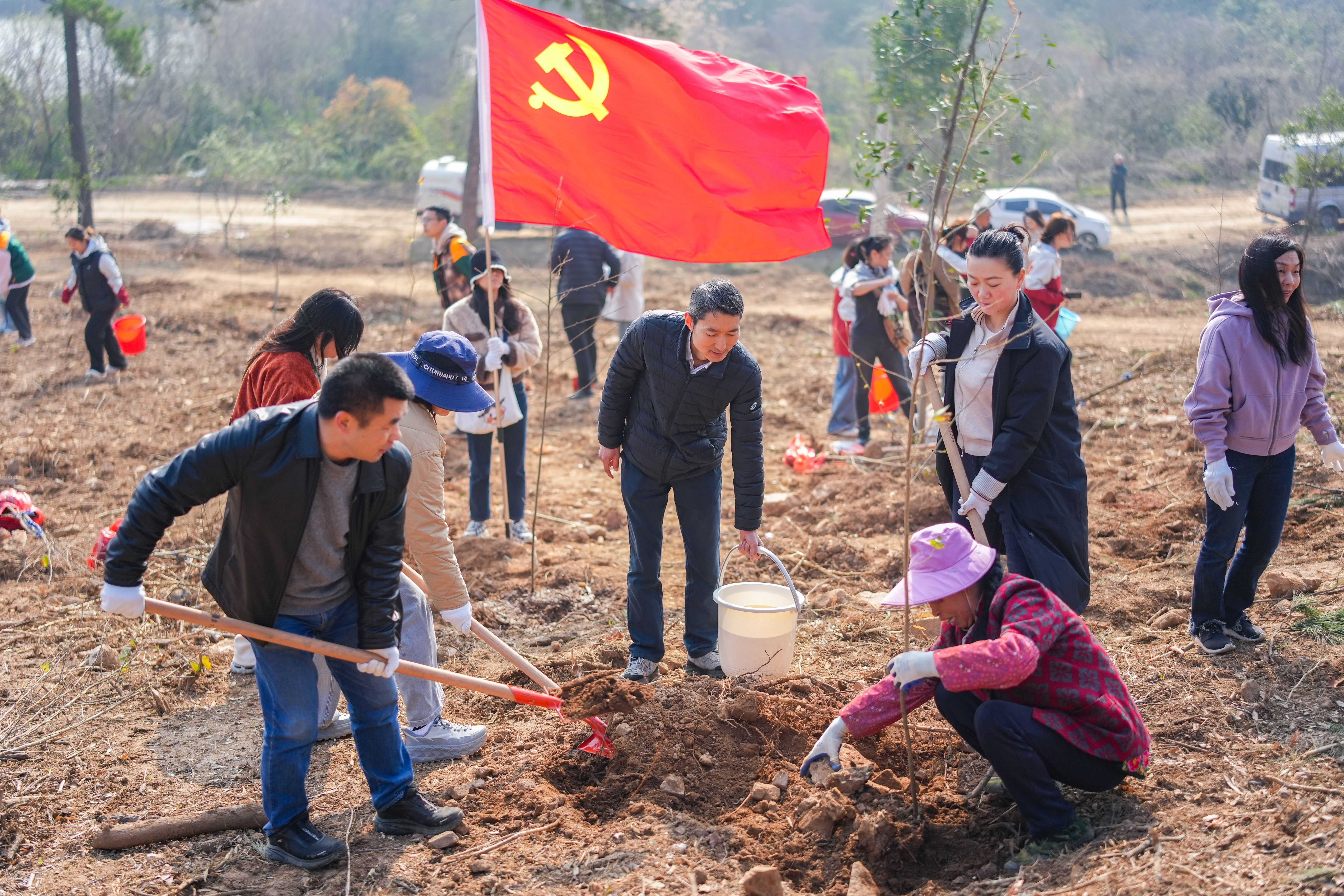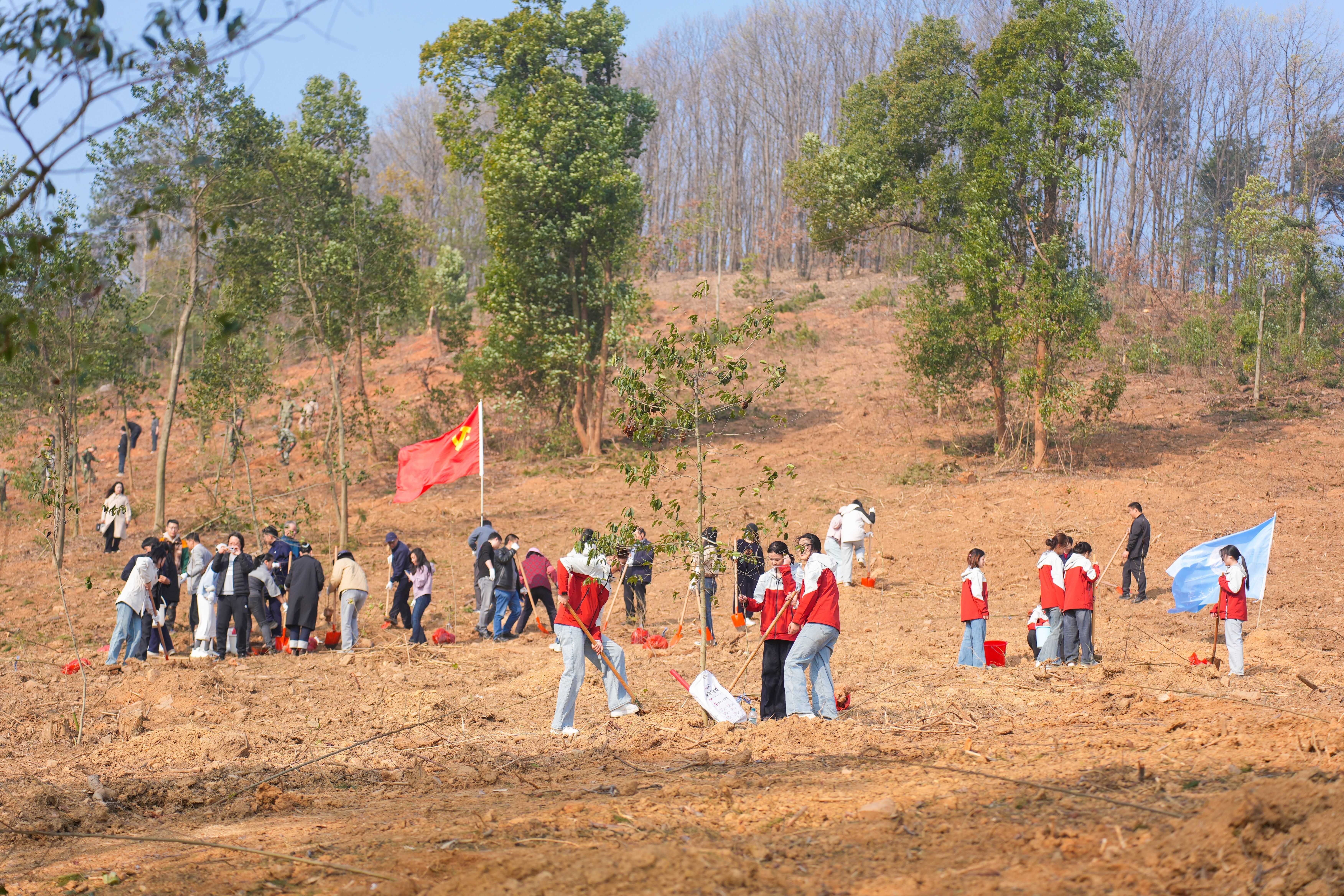 12日上午,武汉市首批碳中和林基地、国家“互联网+全民义务植树”基地蔡甸区嵩阳林场义务植树点彩旗飘飘,人头攒动。硚口区烟草专卖局等单位和市民挥锹添绿,种下6000株树苗,树种包括枫香、乌桕、青冈和桢楠。