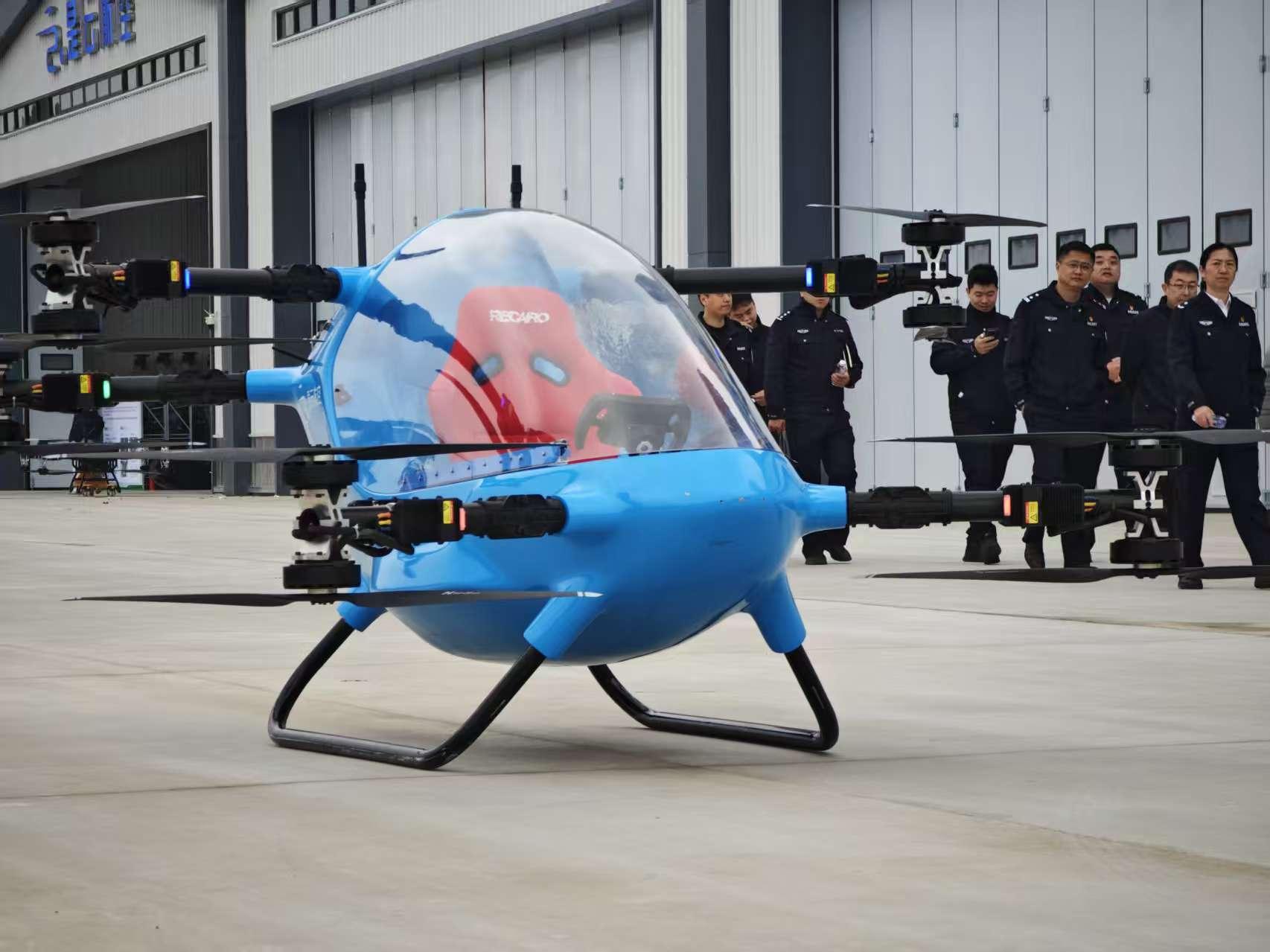 在汉阳造低空生态中心,记者见到了这款名为“是云一号”的电动垂直起降飞行器。这款蓝色飞行器机舱能容纳一人,启动后就会原地平缓升起。“这款飞行器起飞重量300公斤,续航20分钟,独创汽车式方向盘操控降低门槛。”是云航空董事长胡乐说,“只要会开车,就会驾驶这个飞行器。”