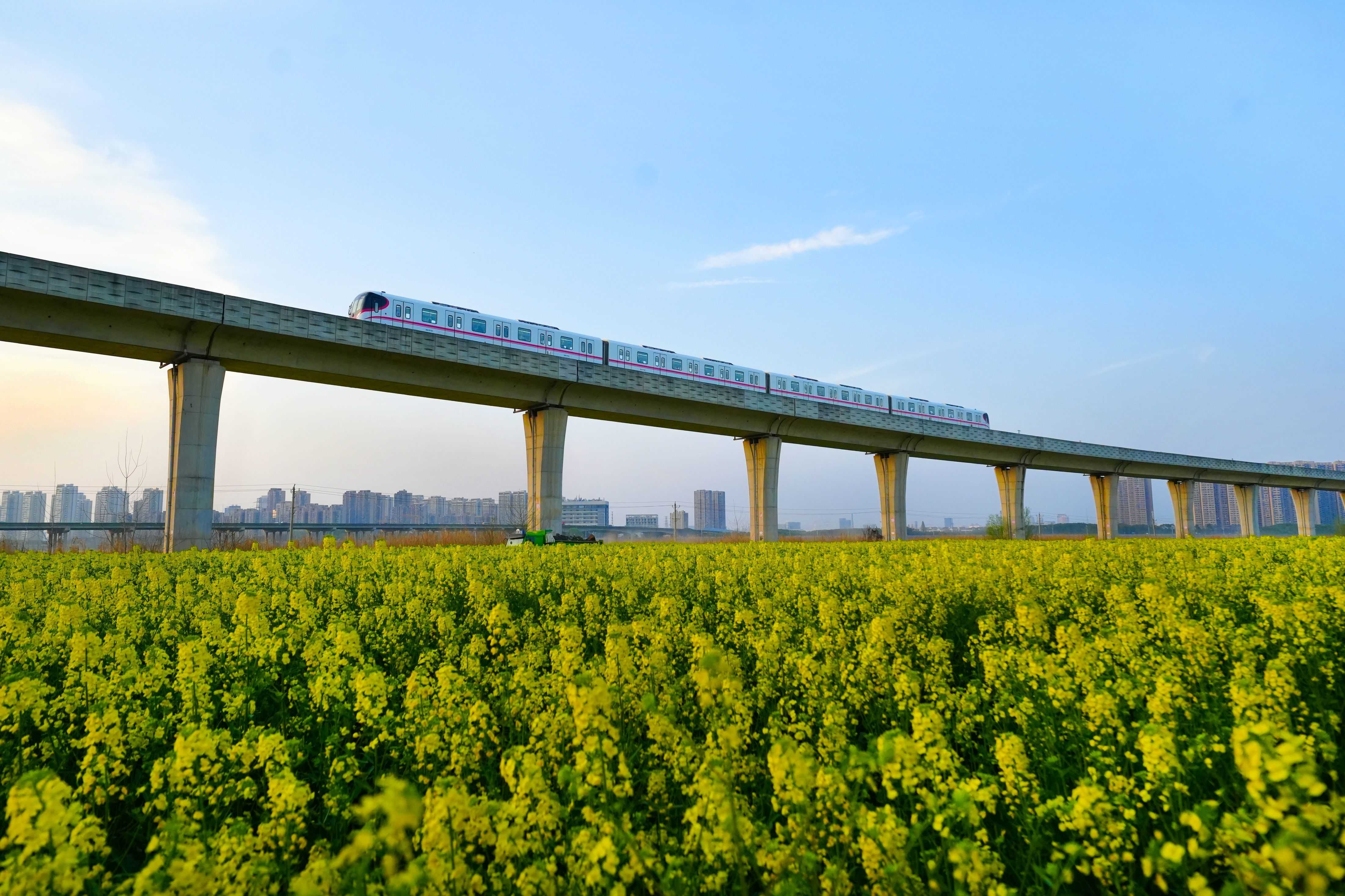 春和景明,万物生发。连日来,随着天气持续晴好,武汉地铁16号线沌口至小军山之间6.2公里的高架临江区段,迎来了春日最美景致。轨行区两侧油菜田竞相绽放,金黄花海与浩瀚江水交相辉映,列车穿行其间,宛如进入流动画卷,呈现出“车在花中行,人在画中游”的春日浪漫。