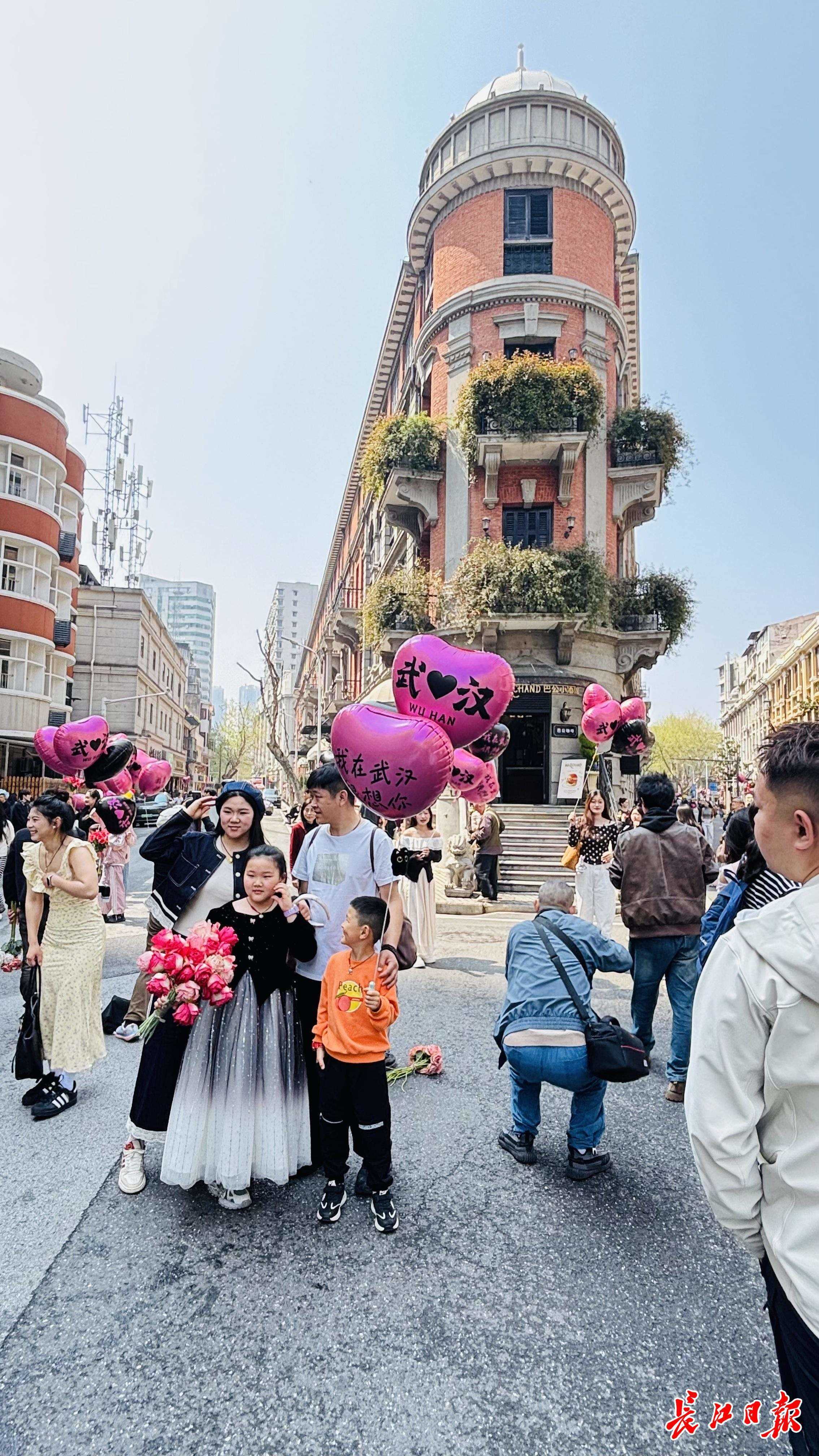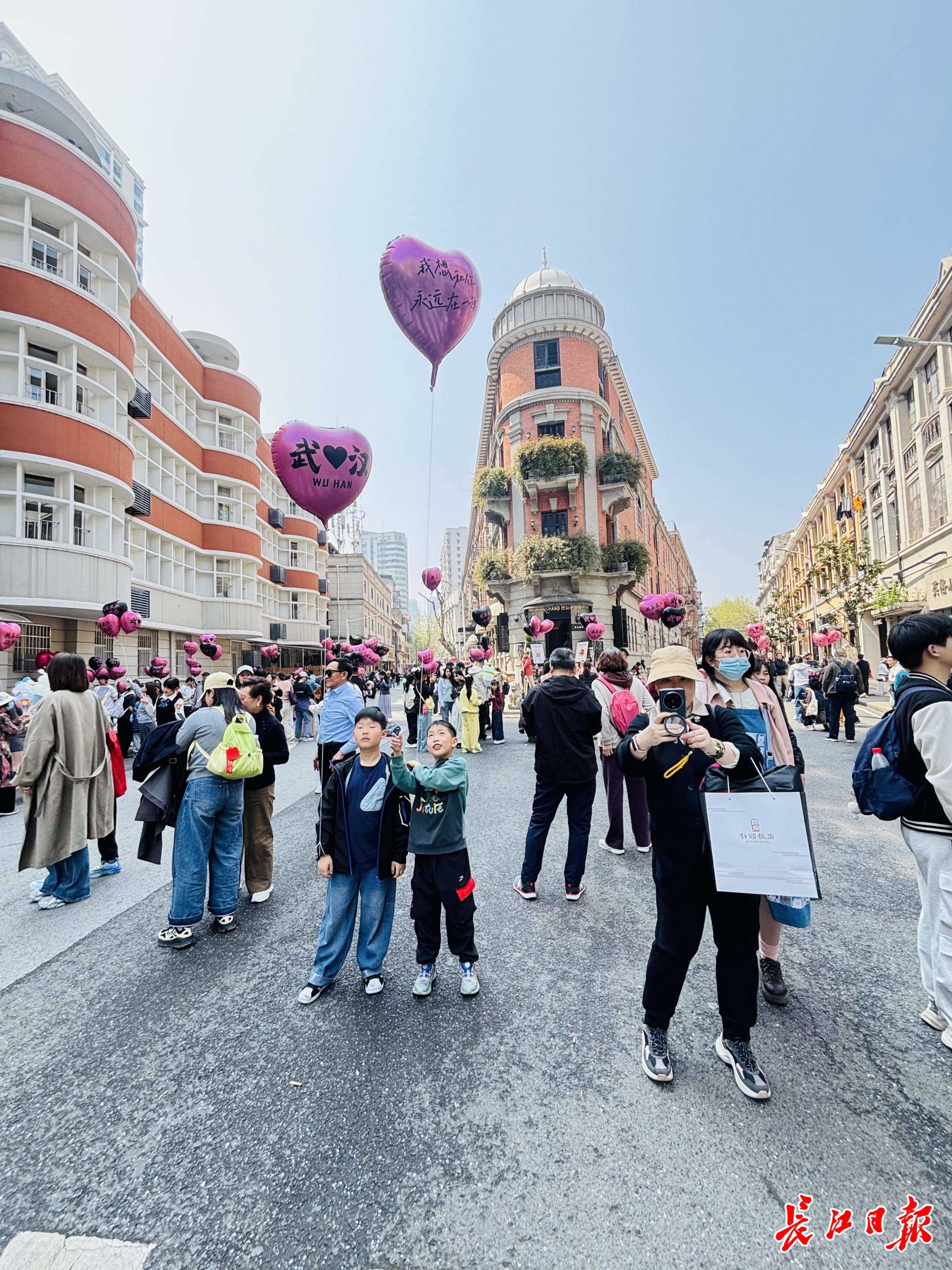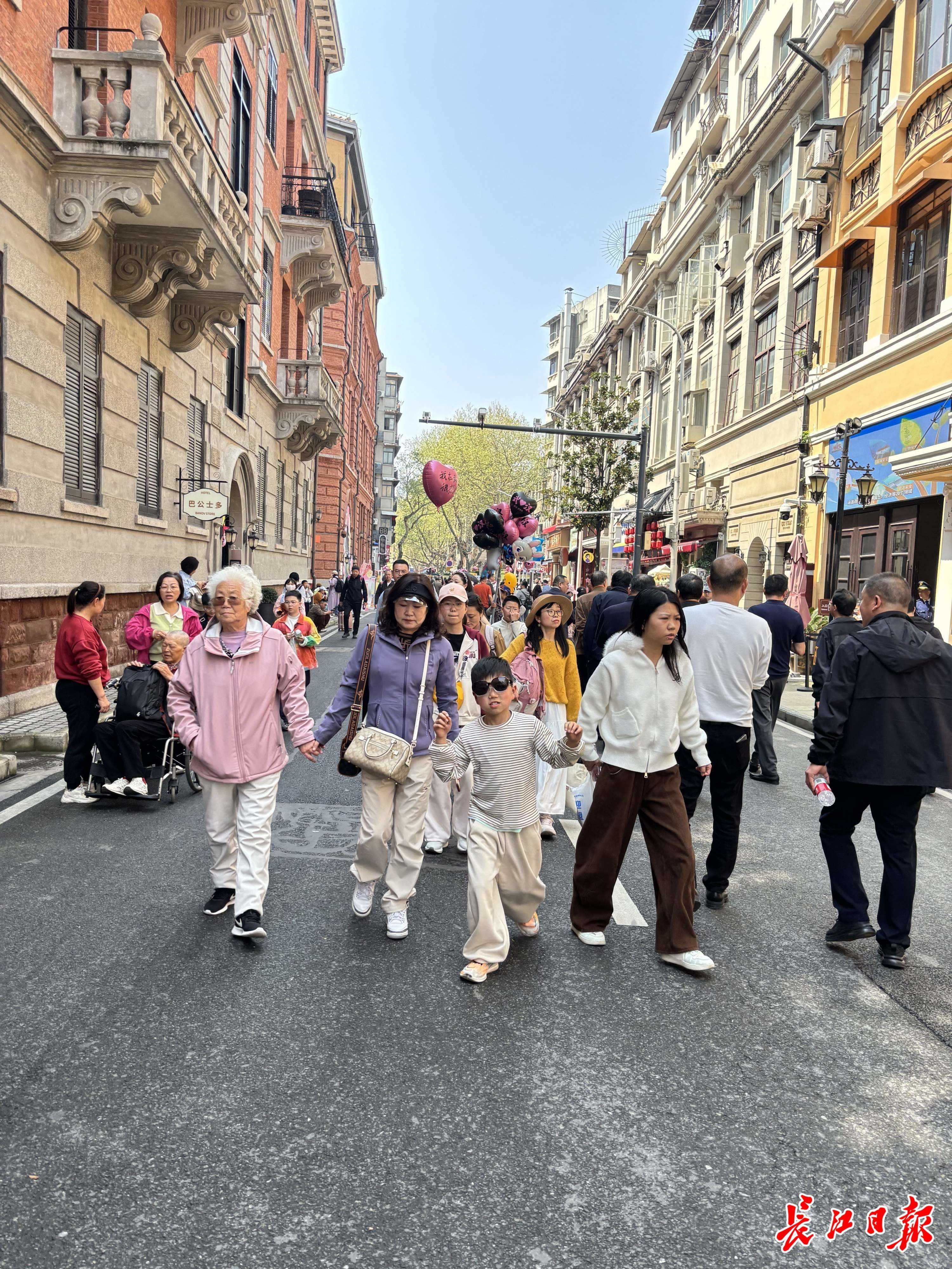 在巴公房子前,这座百年红砖建筑已成为亲子游的“必拍”背景板,房子前到处站着拿着“我爱武汉”气球的孩子。来自四川乐山的12岁男生严秋林和妈妈特意选择入住巴公邸酒店,感受历史建筑与现代旅宿的融合。“昨晚入住后,晚上去江滩看了长江灯光秀,今天一早就在这附近转悠,妈妈给我拍了好多照片。”严秋林说。来自安徽的刘先生一家三口拖着行李箱,第一站就到了巴公房子,“今天早上坐高铁出发,交通非常方便,今天下午去东湖、明天去黄鹤楼,就到处走走。”