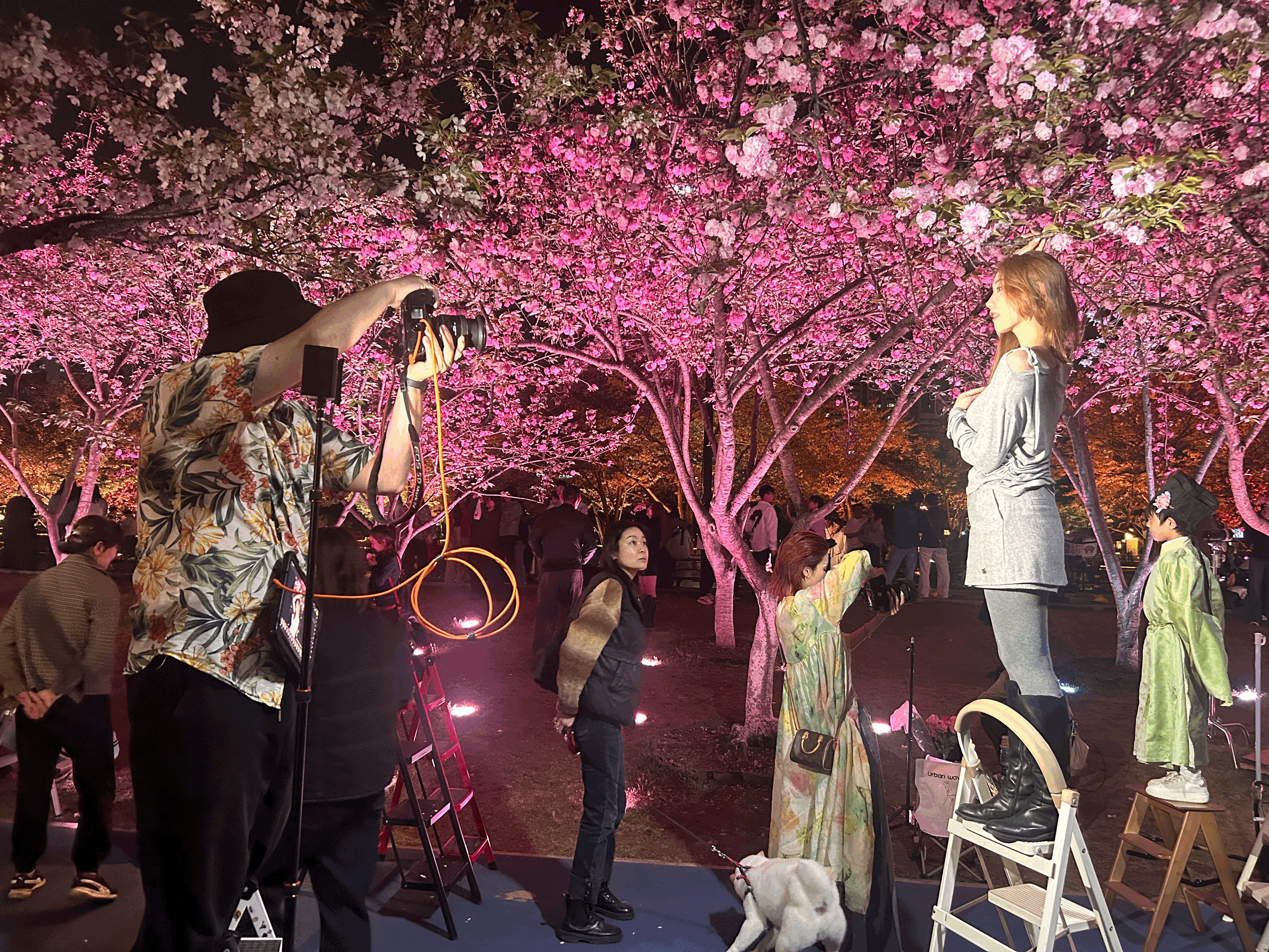 4月1日傍晚,西北湖公园近百米长的樱花步道两侧,每隔几米就有一位摄影师举着相机,脚边放着梯子、反光板、补光灯。快门声、欢笑声此起彼伏。