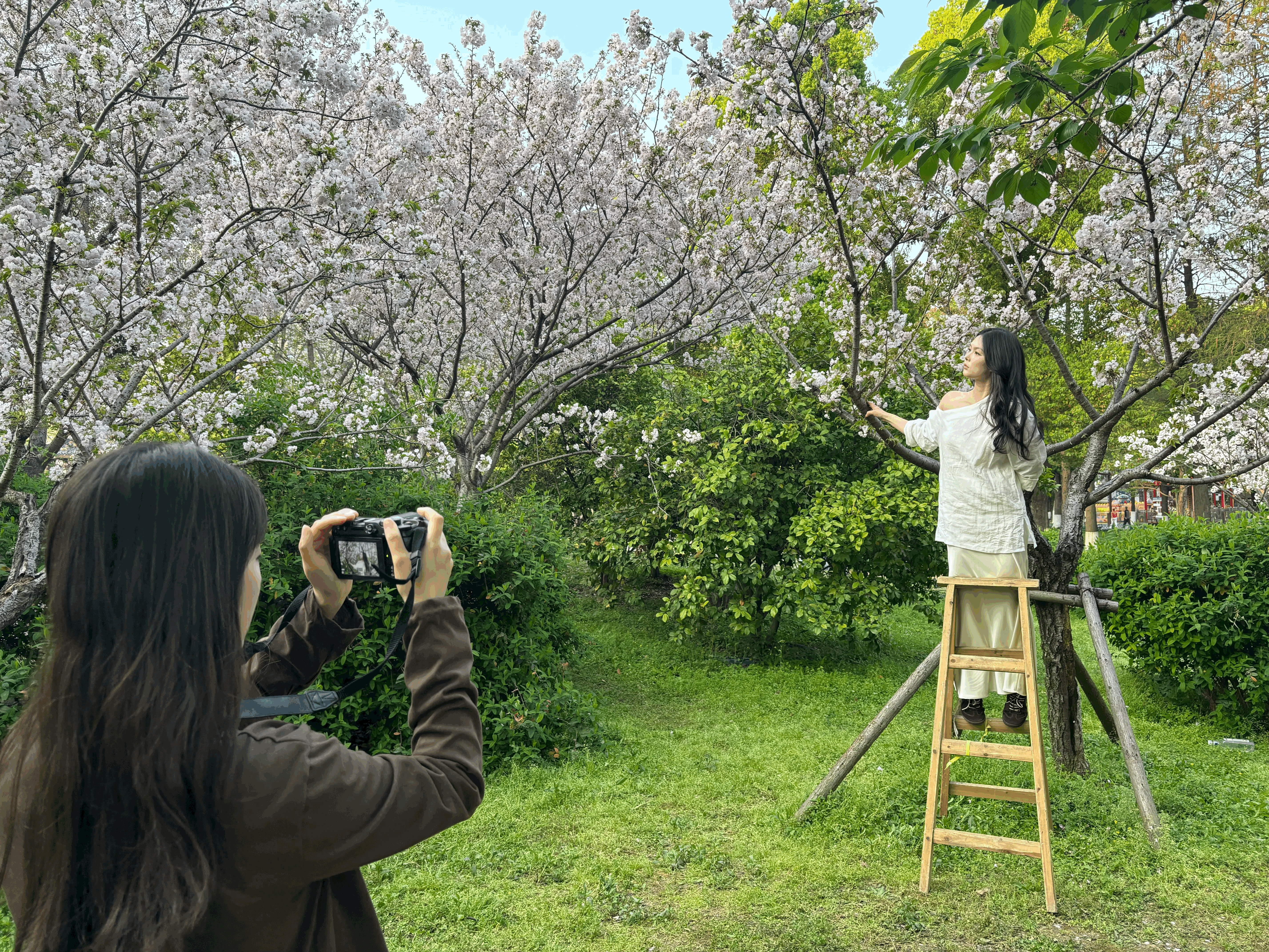 在堤角公园,28岁的摄影师妮妮正在等候客人,今年是她首次接单约拍,收费每小时75元,一天最多接三四单。“我会把顾客集中在一个地方,这样机位、光线都熟悉,效率高。”她还会给顾客服装和妆容建议,“拍白色樱花建议穿粉色或蓝色的衣服。”