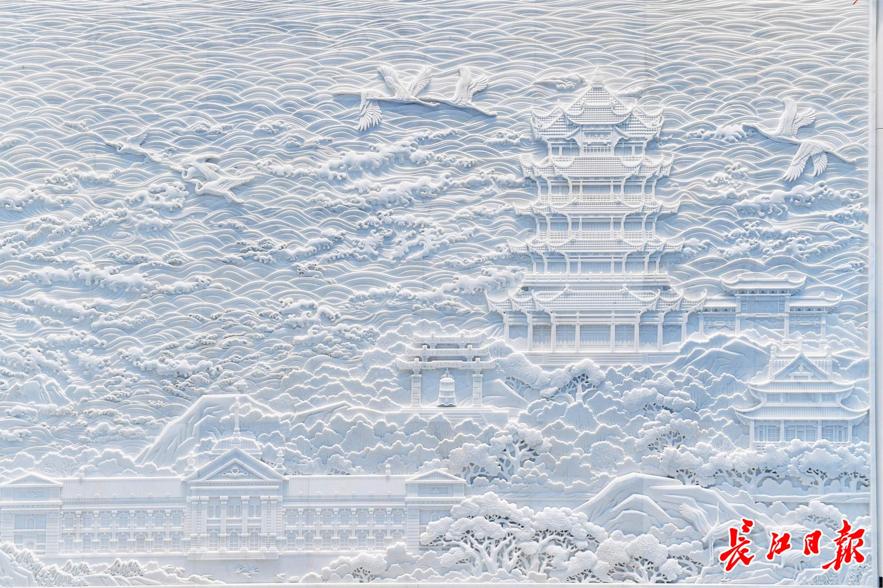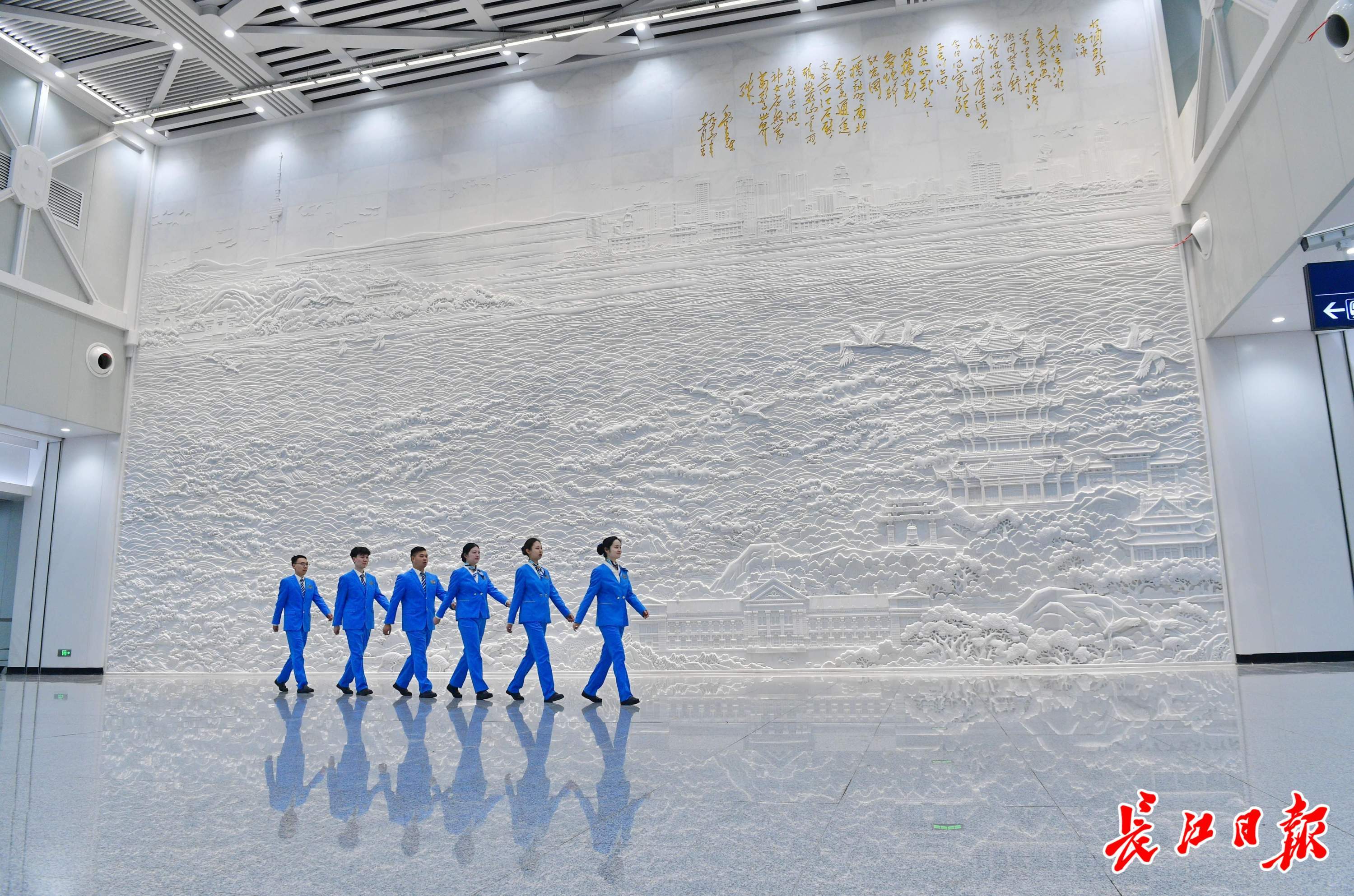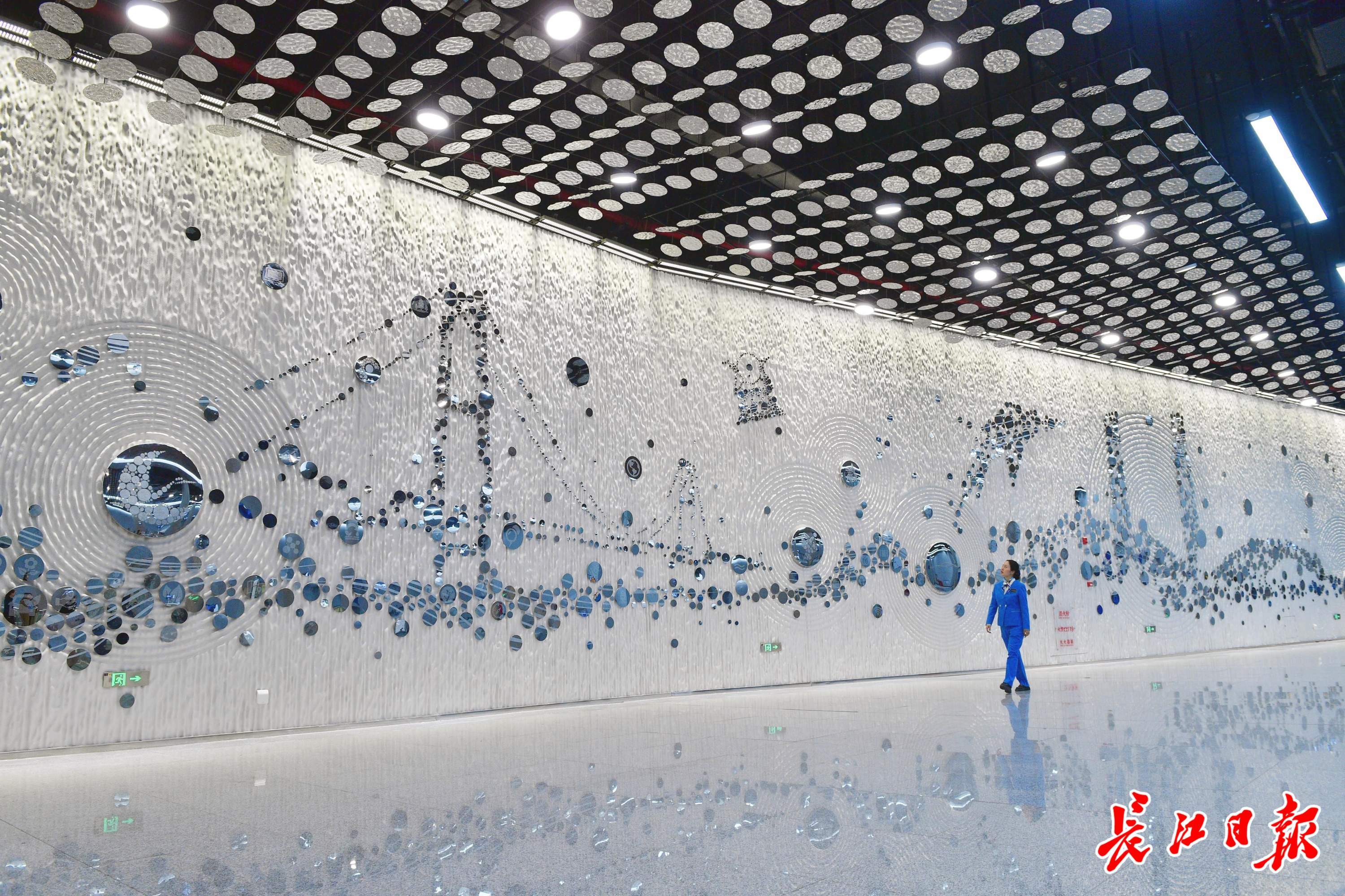 记者看到,换乘大厅艺术设计以武汉长江大桥为切入点,中庭侧墙以大桥钢桁架为设计灵感,将大桥元素融入空间装饰。12米高的艺术墙令人惊艳,上面雕刻黄鹤楼、龟山电视塔等长江地标建筑,构建桥下江岸与桥外江畔的时空对话。