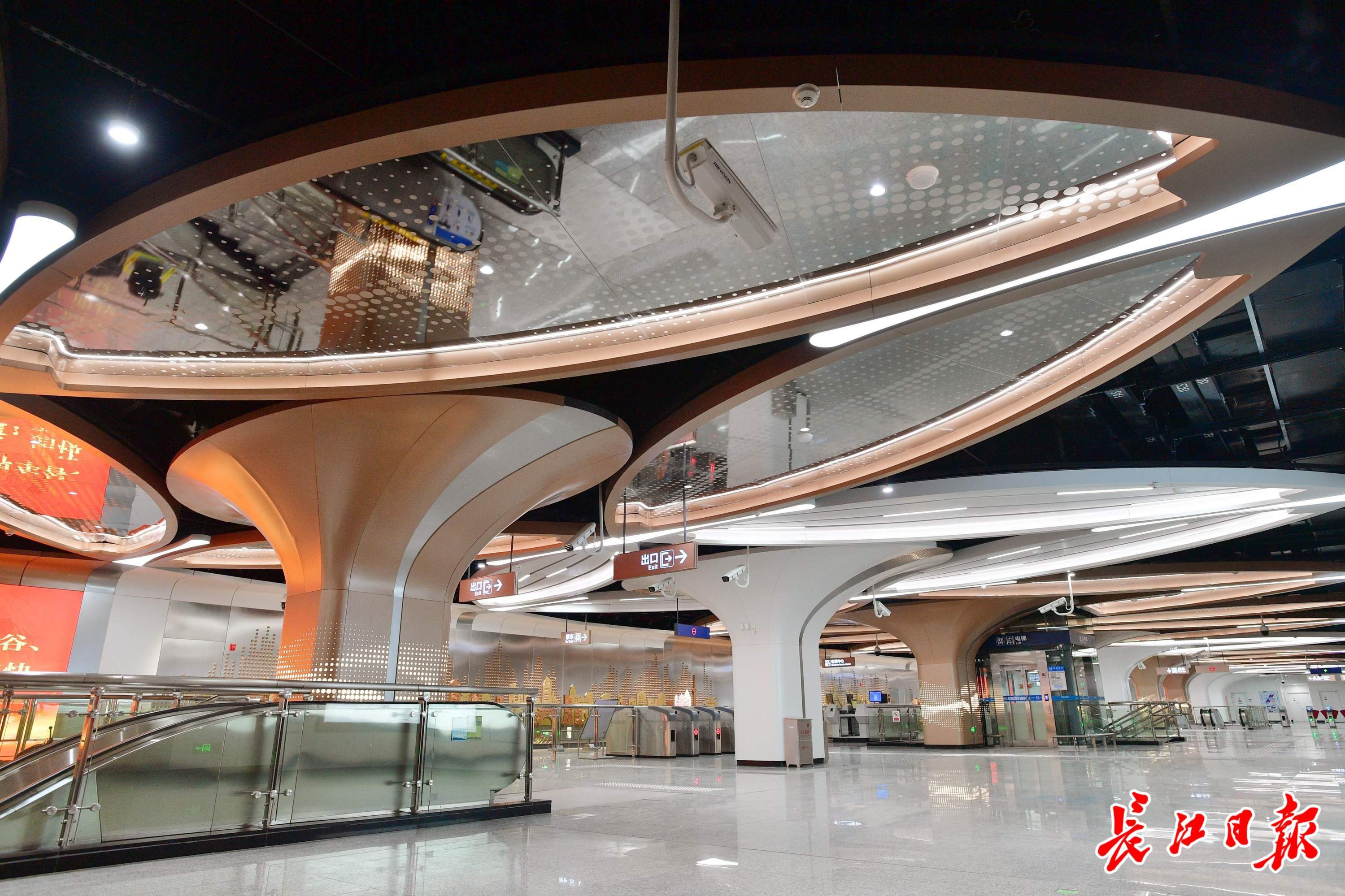 中铁四局项目总工白晓杨介绍,公正路站以“云游汉街”为设计主题,将周边沙湖、东湖的自然灵韵与楚河汉街、武汉SKP的商业活力完美熔铸于空间之中。站厅内,以水流的婉转曲线、花瓣的柔美弧形为核心元素,搭配大镂空设计手法,让站厅动线如行云流水般灵动。