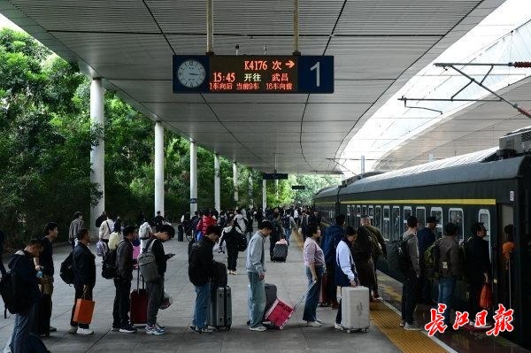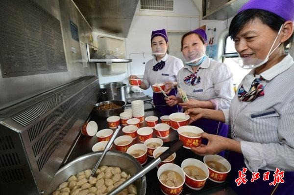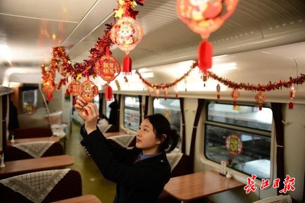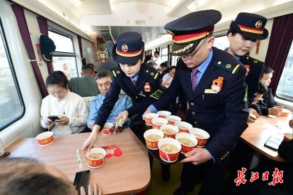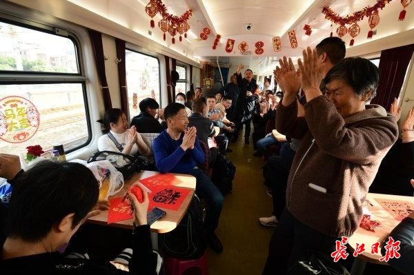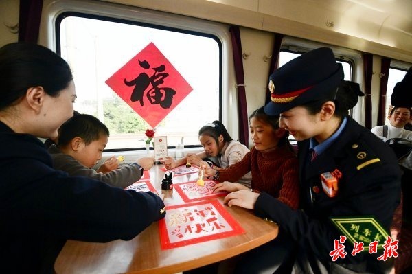 2月11日15时45分,随着一声汽笛响起,由中国铁路武汉局集团有限公司武汉客运段武昌南线车间临客四组值乘的K4176次临客列车从深圳东站缓缓驶出,载着两千余名思乡心切的湖北老乡,向着武汉的方向疾驰而去。列车长边毅和童玉帛特别装扮了车厢,旅客一进车厢就有回家的感觉。今天也恰逢南方小年,车上餐车特别煮上饺子,分发给旅客,旅客吃上热腾腾的饺子,仿佛已经到家。车上列车员还准备了游戏,画福字让车上的孩子们开心过年。同时列车员和乘警不间断巡视车厢,帮助旅客解决问题。