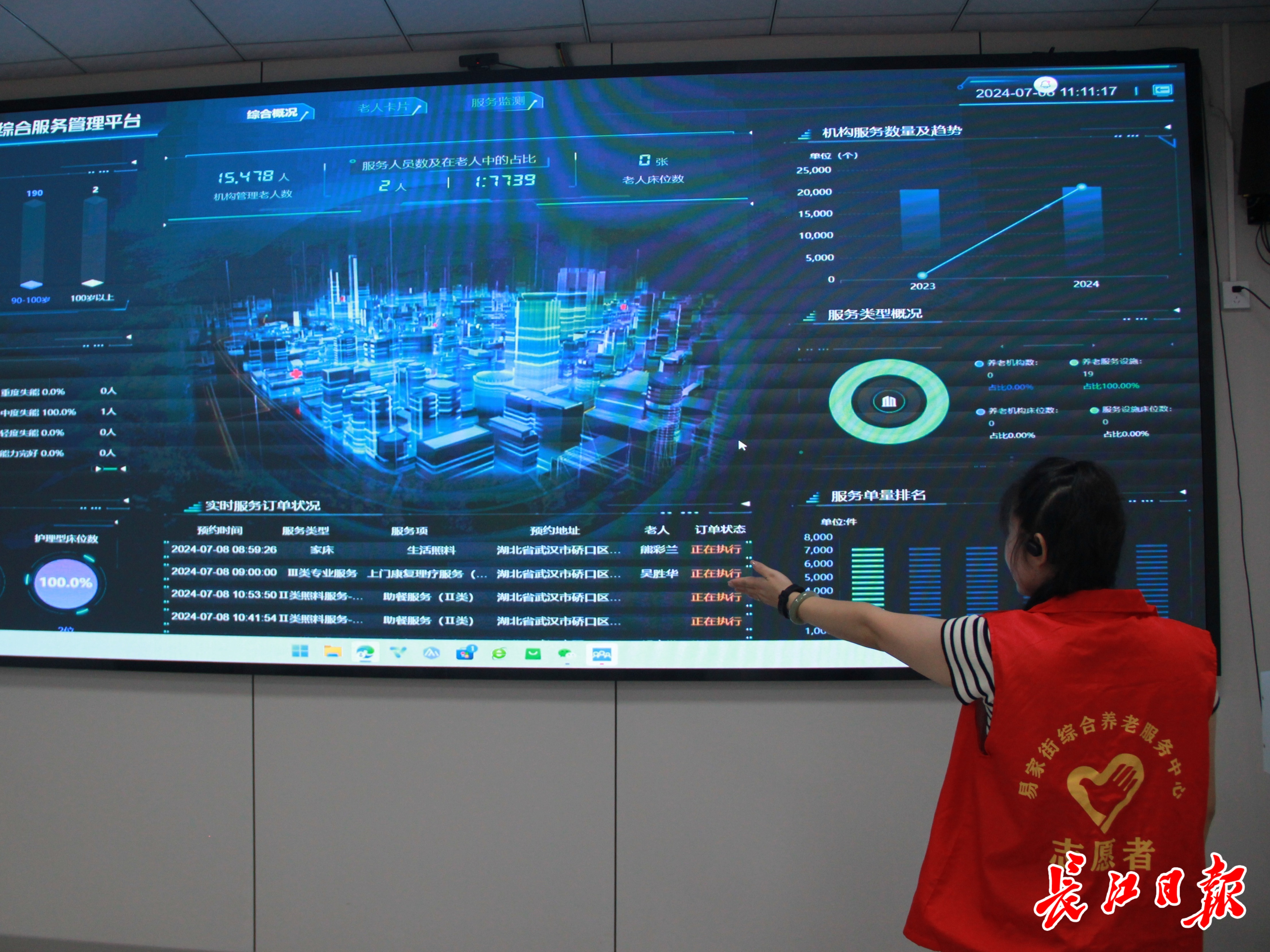 该社区是开展人工智能养老社会实验试点创建工作的首批社区。工作人员展示了智慧养老综合服务管理平台,记者看到,被纳入管理的社区老人的年龄分布、身体能力等级、实时服务订单等信息全部在平台上一一呈现。