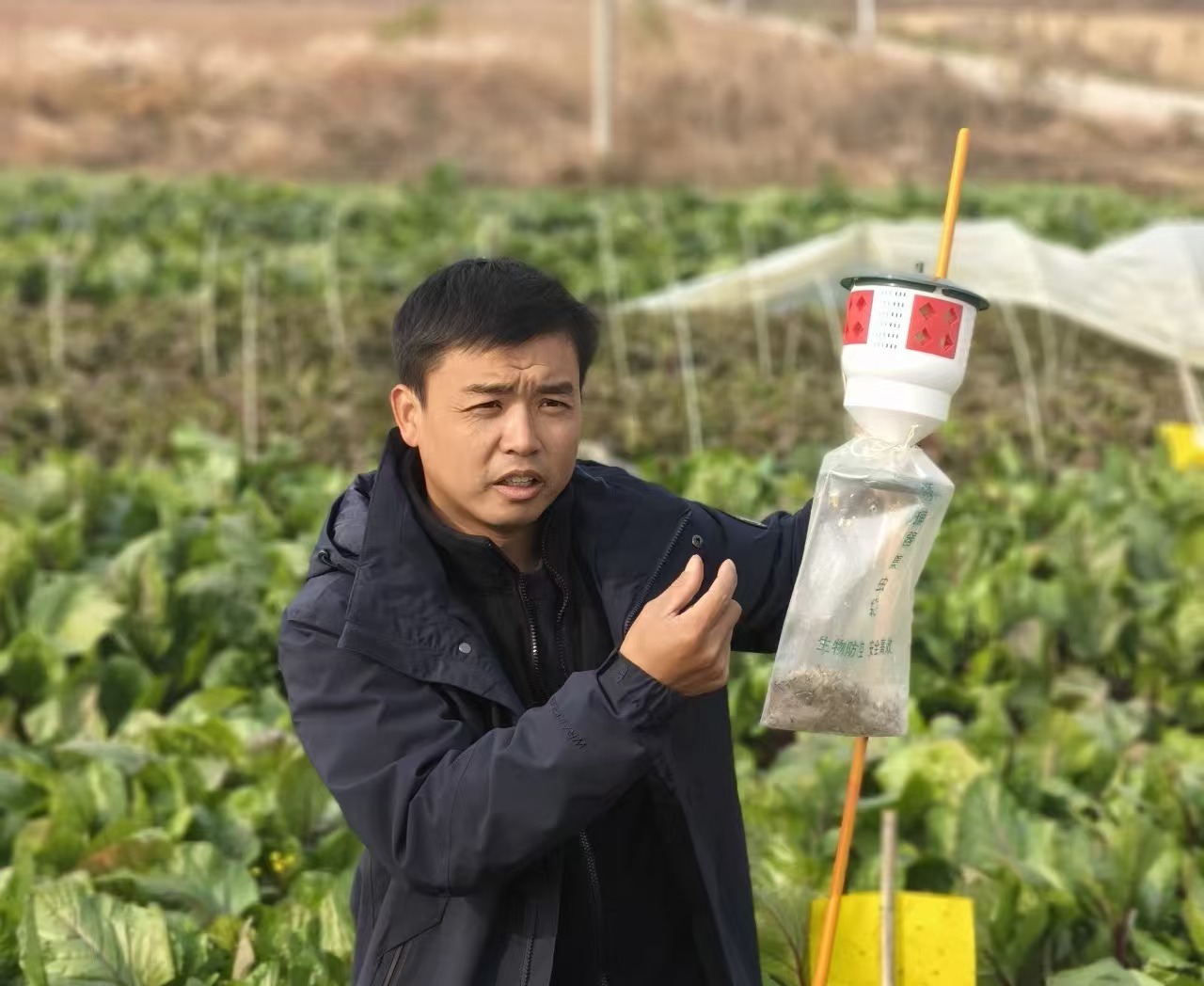 “新农人”潘均在农场的菜地中给众人讲解物理灭除病虫害。