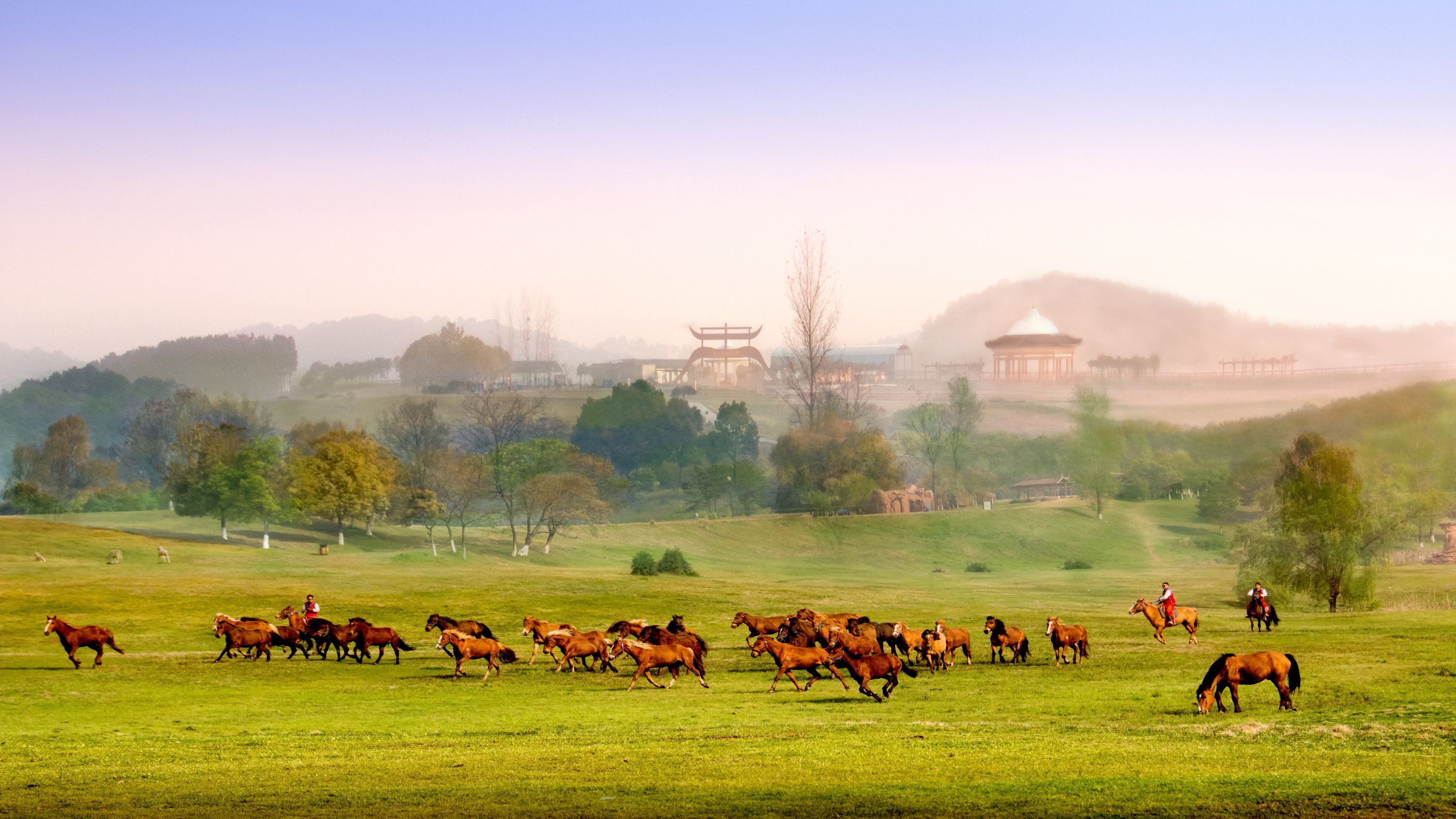 华中唯一草原风情景区木兰草原骏马驰骋。