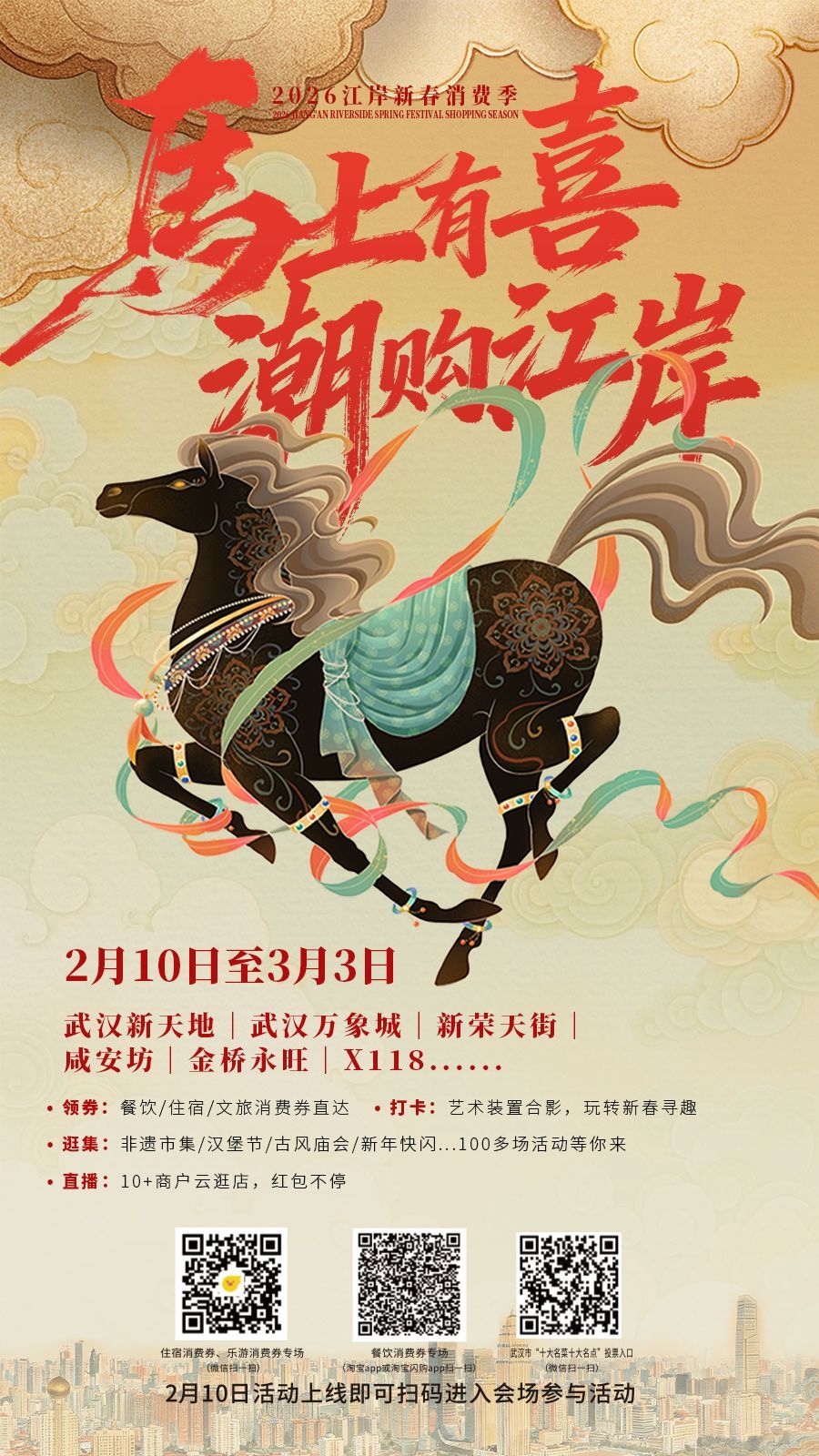 武汉新天地“好事hua生”IP活动设置8大场景,推出多款全国首发城市限定款产品。武汉万象城举办“骏马巡新岁”新春主题艺术展,开启“2026年HOCH汉堡节”全国巡展首站,汇聚十大热门汉堡品牌。以“寻找马年元素”为主线,黎黄陂路、咸安坊等5处特色商圈商街将设置打卡装置,在“二维马”扫码点,市民扫码即可领取各类消费券,春节假期前,专业摄影师也将在现场免费为市民拍照留念。
