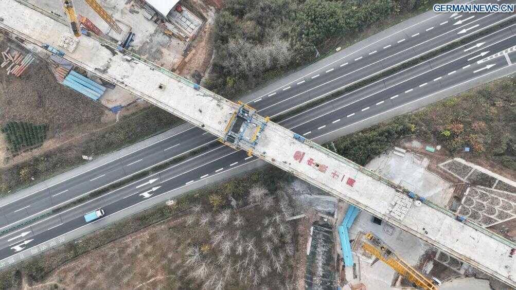 Die Luftaufnahme einer Drohne vom 2. Dezember 2025 zeigt die Baustelle einer Brücke der Hochgeschwindigkeitsbahnstrecke Hefei-Wuhan über die Schnellstraße Shanghai-Chengdu im Kreis Jinzhai der Stadt Lu'an in der ostchinesischen Provinz Anhui. Die 1.940,57 Meter lange Brücke wurde am Dienstag fertiggestellt. (Quelle: Xinhua/Zhou Mu)