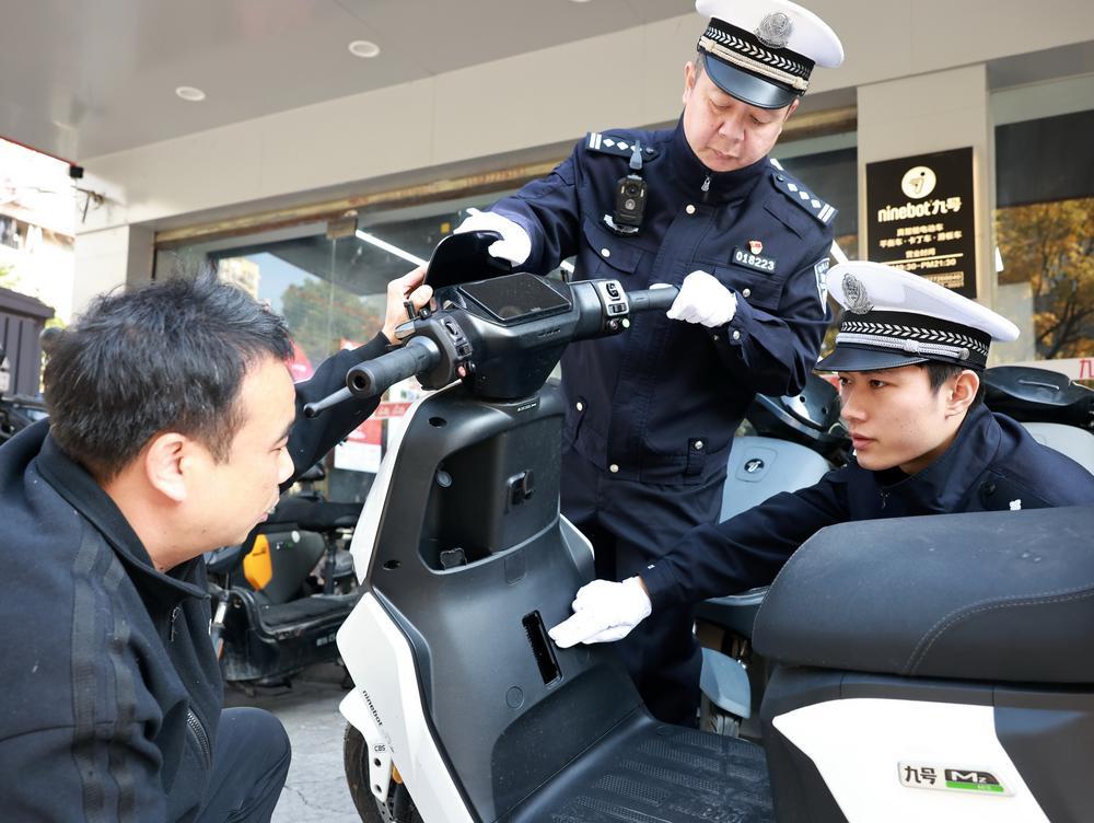 (중국 우한=신화통신) 1일 후베이(湖北)성 우한(武漢)시 우창(武昌)구에 위치한 한 매장에서 민경이 판매 직원에게 '구(舊) 국가표준' 전기 자전거(전기 오토바이) 판매 중지 정책을 설명하고 있다.