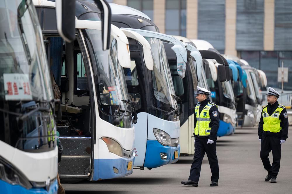 29일 후베이(湖北)성 우한시 훙지(宏基)버스터미널에서 버스를 둘러보는 교통경찰들. 2026.1.29
