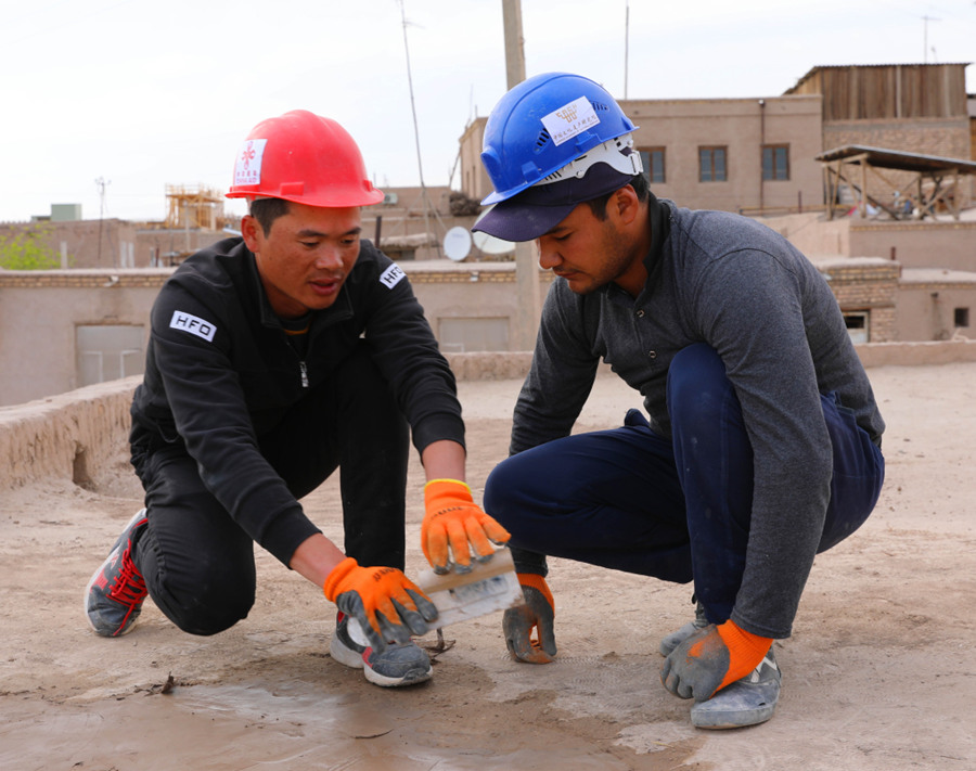 중국 측 문물 복원 작업자가 고대 도시 히바에서 우즈베키스탄 직원에게 한 이슬람교 사원의 지붕 복원 작업을 지도하고 있다.