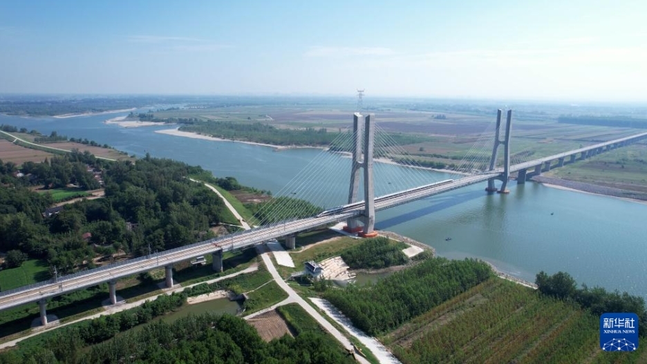 テスト車両55402号が、滬渝蓉高速鉄道武漢-宜昌区間の鐘祥漢江特大橋を通過する様子