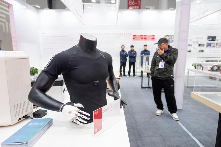 12日、博覧会会場に展示されたバイオニックハンド。(武漢=新華社記者/肖芸九)
