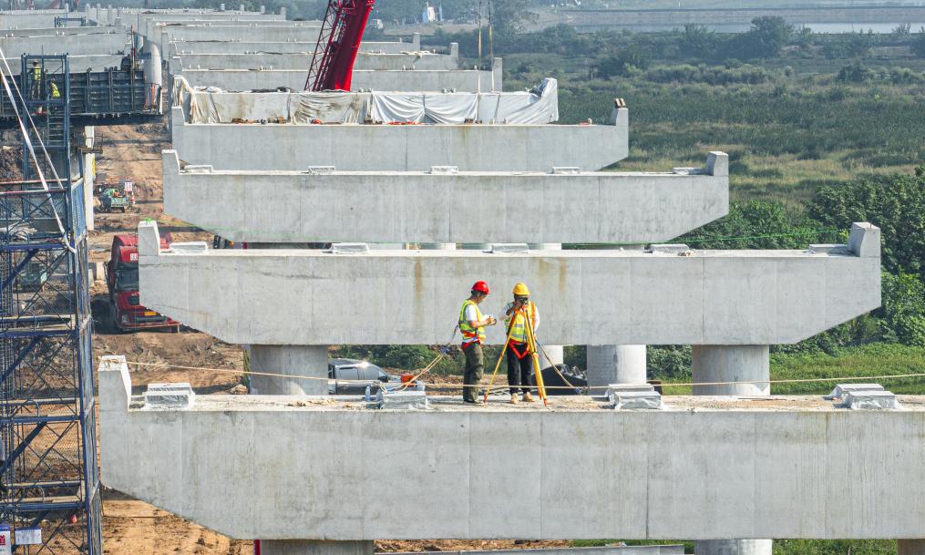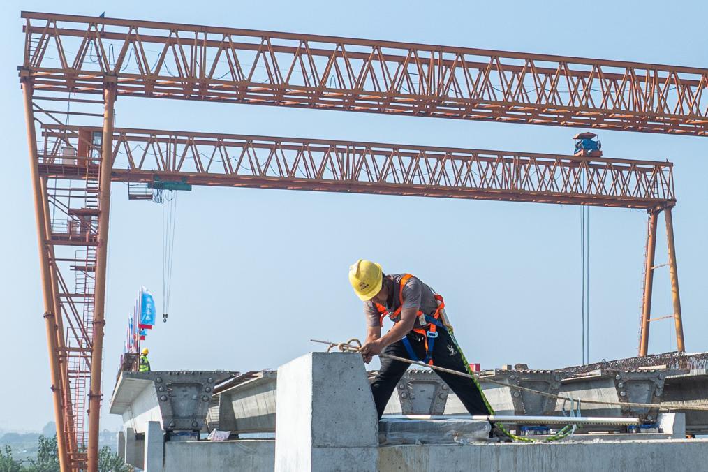 中国湖北省で整備が進む「武漢都市圏環状高速道路」で、西部に位置する孝感南区間の建設作業が続いている。中秋節に当たる6日も、建設を請け負う中鉄二十局集団の作業員200人余りが現場に立ち、コンクリート製の箱桁を高架区間に据え付ける作業を進めた。