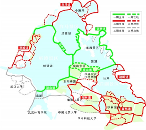 According to the upfront planning, the second phase project will build five themed greenways, named the Hucheng (meaning: lake and city) Greenway, Huze (lake and wetland) Greenway, Hulin (lake and forest) Greenway, Huting(lake and lane) Greenway and Senlin(forest) Greenway.