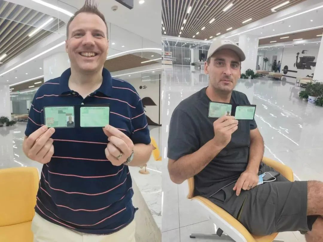 The photo shows that two foreign teachers from Wuhan Yangtze International School successfully obtained their Chinese driver's licenses at Wuhan Immigration Service Center.
