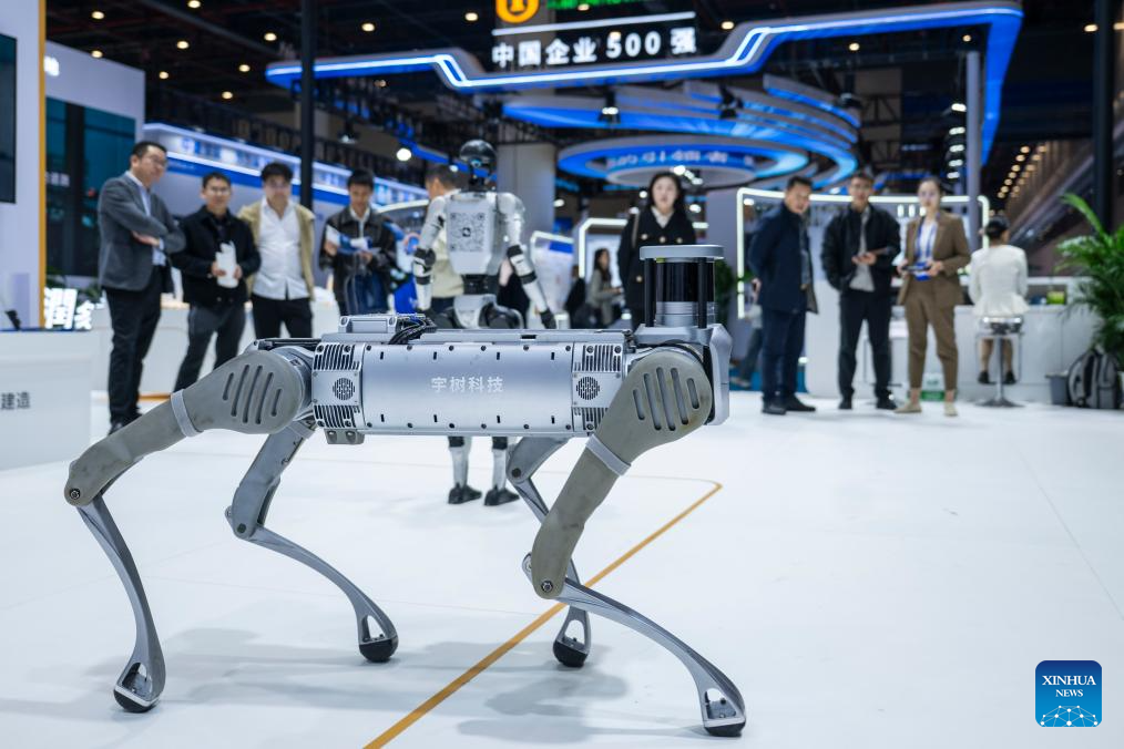 People look at a robot dog from Unitree Robotics during the 2025 International (Wuhan) Intelligent Building Industry Expo at the China Optics Valley Convention and Exhibition Center in Wuhan, central China's Hubei Province, Oct. 31, 2025. With an exhibition area of approximately 20,000 square meters, the expo kicked off here on Friday, drawing exhibitors from over 10 countries and regions.