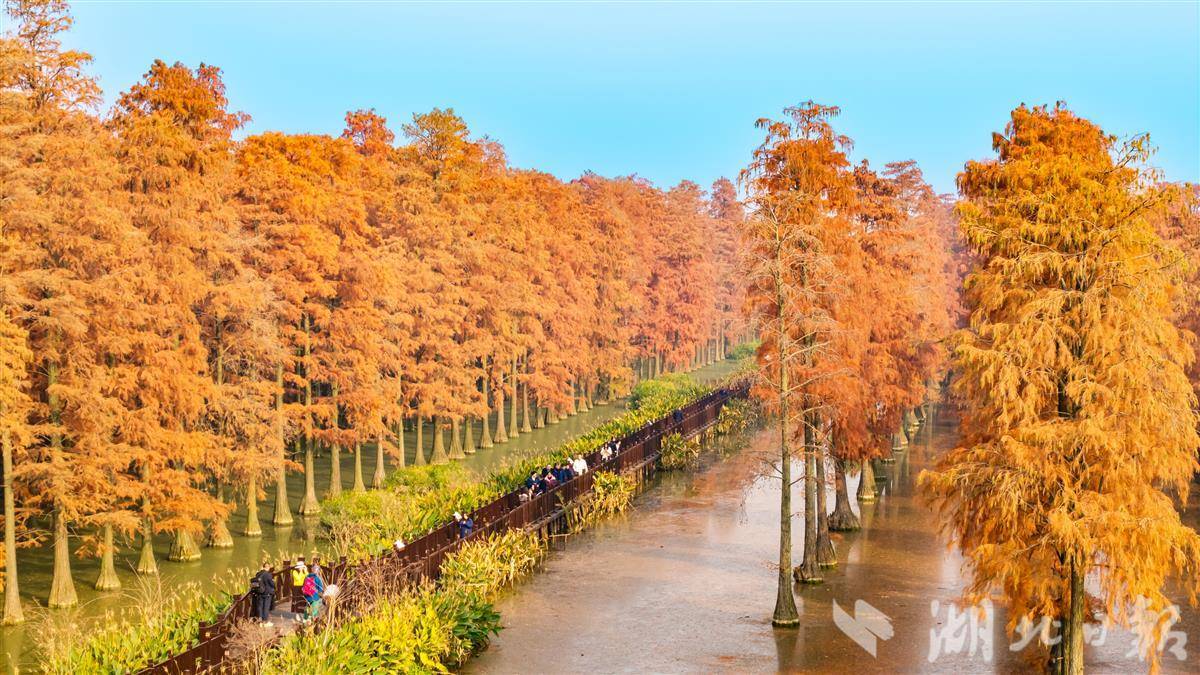 Photo taken on Dec. 11, 2025 shows a splendid winter view of over 500 mu (about 33.33 hectares) of cypress trees in Zhangdu Lake Wetland Nature Reserve, located in Xinzhou district of Wuhan, capital of Hubei Province. Recently, the cypress forests at the Zhangdu Lake Wetland Nature Reserve have entered a vibrant and colorful season, offering breathtaking views to visitors.