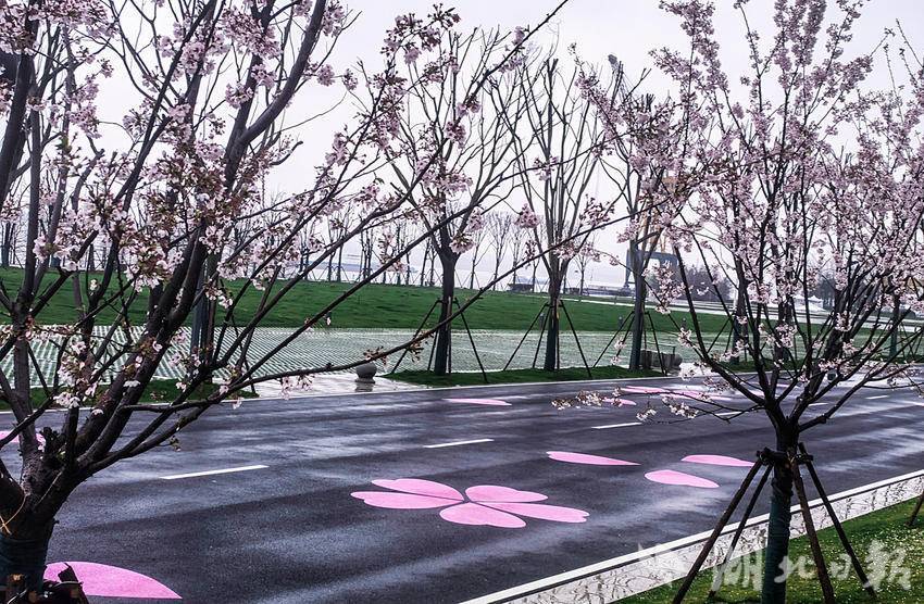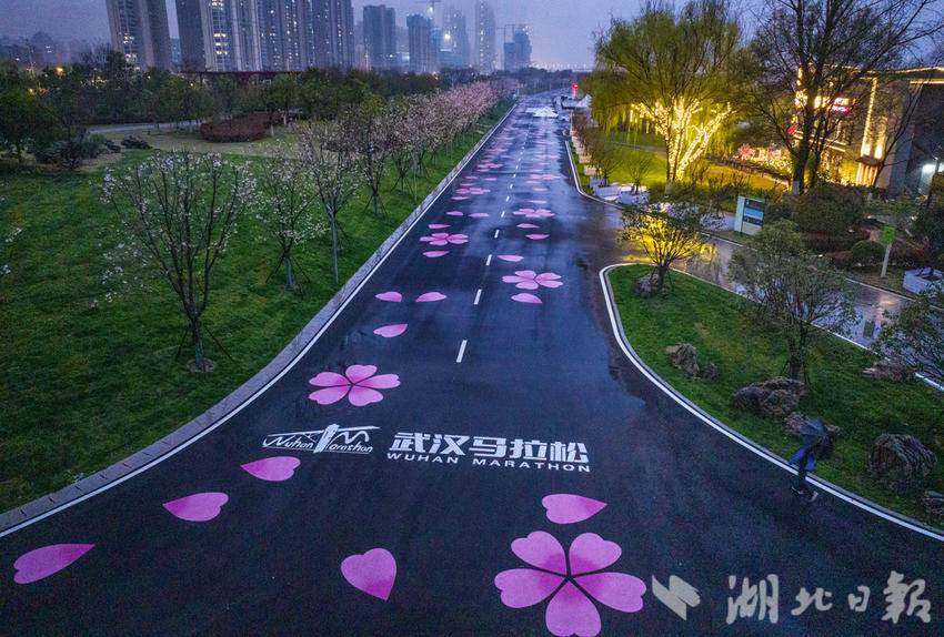 Photos taken on Mar. 16, 2026 show a bird's-eye view of a section of 2026 Wuhan Marathon track at the Qingshan Bund in Wuhan, Hubei Province. The 760-meter track has been painted with pink cherry blossoms, awaiting the upcoming race.