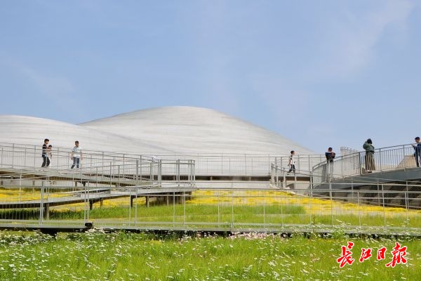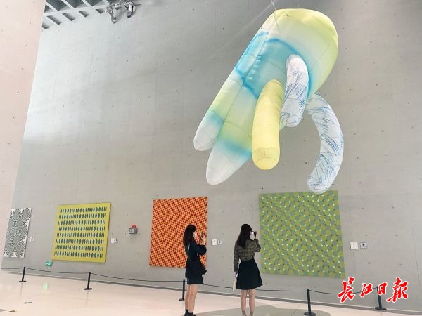“这已经是第二次来看双年展了。”和朋友一起逛展的观众王蔚然告诉记者,“一个月前来看过之后意犹未尽,作品太丰富太有趣,值得细细品味,趁着假期再来感受艺术之美。”高颜值的琴台馆室外夜游有不少漫步打卡的观众,不经意间也能遇到室外陈列的展品。现场还有从外地来的游客特意做好攻略前来打卡武汉双年展。“之前在网上看到不少艺术展的高颜值照片,很心动,这次来武汉游玩特意安排了半天在琴台美术馆观展。”从河南来武汉旅游的她在展厅内拍个不停,还特别喜欢馆内各种艺术互动装置和中国画,“既有创新风格的作品,也有传统文化的展现,美术馆的设计也很独特,怎么拍都美。”