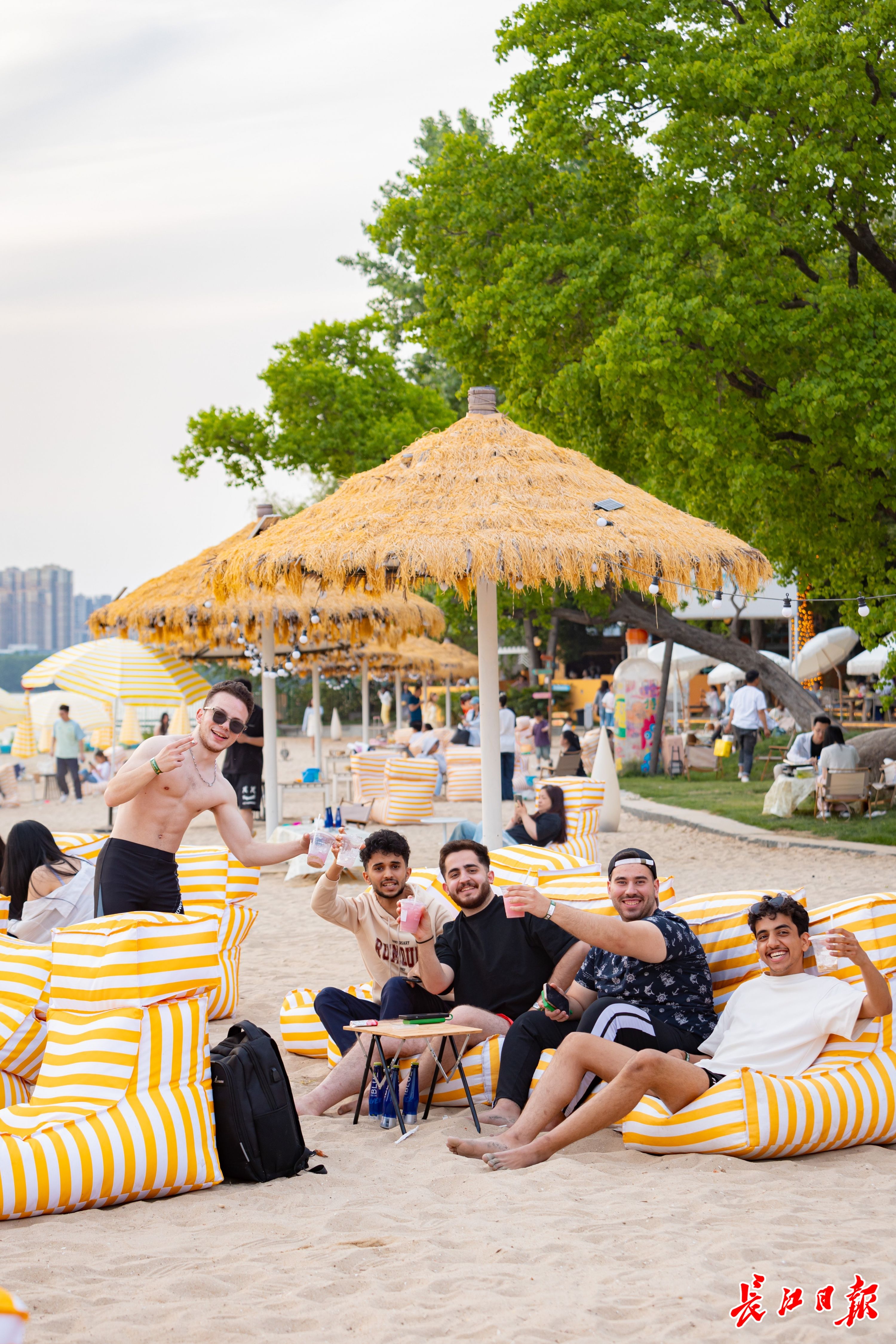 在东湖沙滩,海内外游客不约而同在此度假,沙滩、夕阳、音乐、浪花,心旷神怡,在汉留学生彼得一行身着清凉海岛度假风装扮,选择五一期间在沙滩上“泡”上一天,“在我们的国家,内陆城市没有这样的风景,我们更没有机会像今天一样,不同国家的朋友聚在这里听歌办派对,这就是武汉这座城市的特别之处,包容、前卫、有想法!”