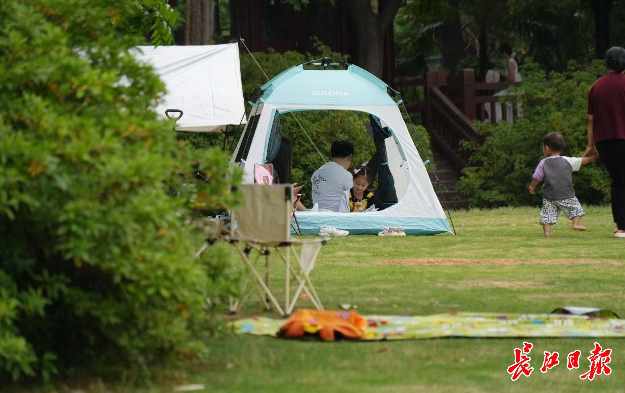 游客在东湖畔度假露营。