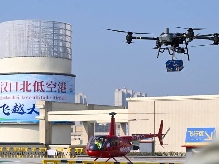 装配快递盒的无人机在汉口北低空港无人机停机坪起飞。