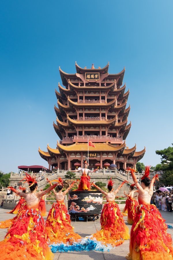 黄鹤楼前《凤舞九天》舞蹈表演。