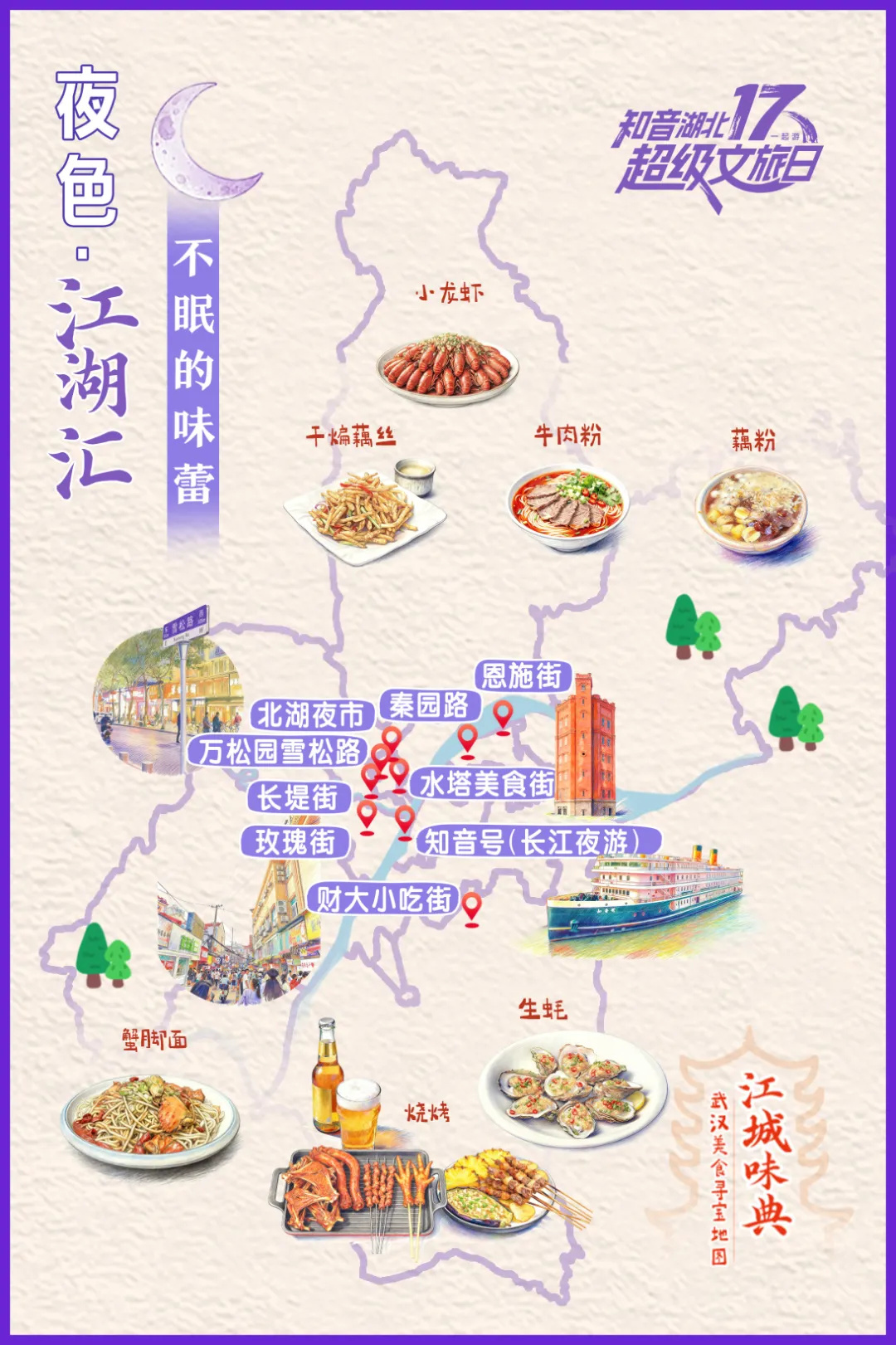 “跟着美食游武汉”,是一场从心灵到味蕾都极致享受的幸福之旅,我们提前征集了网友留言,从老武汉的“私藏小店”到新晋的“网红打卡地”,从江汉路的老字号到光谷的新潮流餐吧,结合江城的地理脉络与文化底蕴,在知音湖北·超级文旅日”17寻味荆楚武汉主会场活动前夕,制成这份“江城味典”武汉美食寻宝地图。它以一天的时间为轴,带你开启一场循序渐进的味觉冒险,读懂武汉的三餐四季与人间烟火。