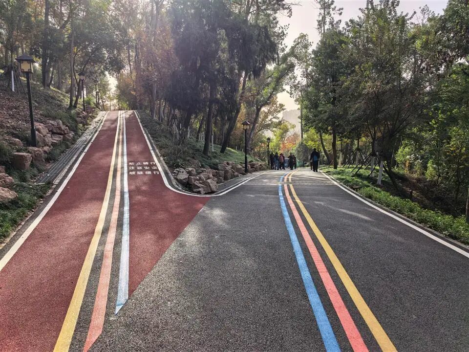 这次建成投用的两条彩色徒步绿道是改造工程的重要组成部分,也是园区远期计划实施的旅游消费新业态新模式新场景项目——“森林徒步空间”的基础性工程。彩道合计长近5公里,宽6米,彩道以间断式安格拉红色铺装为主,中间是红黄蓝三彩间隔线,左右两侧每100米均有起点距离标识,并与东湖绿道二期森林道连接,为游客提供了一条极佳的户外健身运动线路。