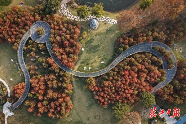 近日,武汉市江汉区常青人才公园内,一条蜿蜒的空中栈道因其秀美的初冬景致,成为市民游客争相探访的“浪漫打卡地”。当初冬暖阳轻洒,游客漫步于栈道之上,两侧的马尾松身披“红甲”,与周边的金黄银杏树遥相呼应,移步换景的特别体验令人称赞不已。