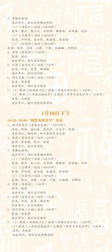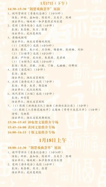 1月17日至18日,将集中呈献黄梅戏、京剧、楚剧、汉剧等经典剧目,让广大戏迷一次过足戏瘾。演出排期紧凑,精彩纷呈。1月17日14:30-15:30,首场“荆楚戏曲荟萃”展演将率先带来七大精彩节目: