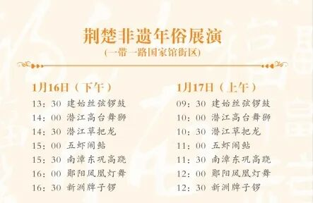1月16日下午至17日上午,建始丝弦锣鼓、潜江高台舞狮、潜江草把龙、五虾闹鲇、南漳东巩高跷、郧阳凤凰灯舞和新洲牌子锣将接连上演,营造喜庆祥和的传统佳节氛围,让游客在逛市集、购年货的同时,感受民俗活力。