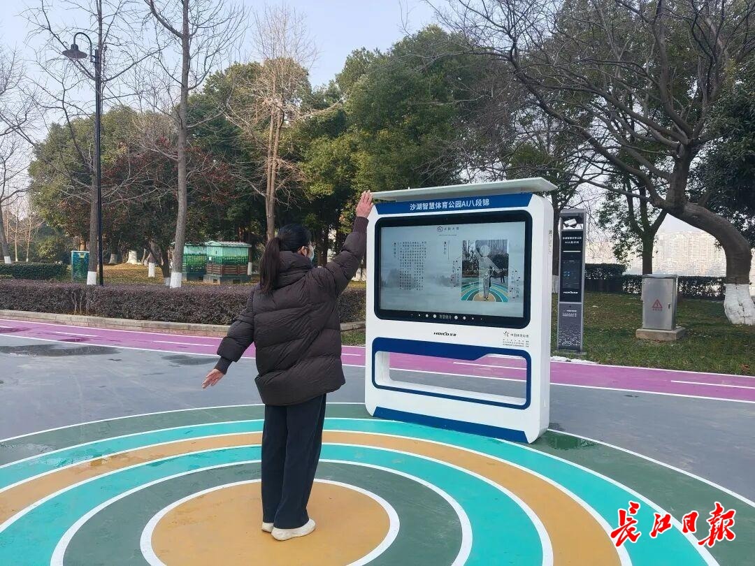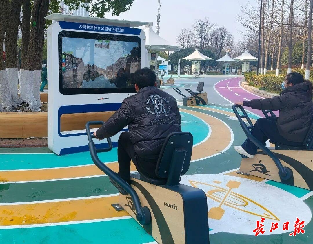 23日上午,长江日报记者走进沙湖智慧体育公园看到,118件崭新的健身器材,沿着约1公里的运动带铺展开来,在AI互动区,AI虚拟骑行、AI竞速划船、AI跳绳、AI八段锦等智慧运动项目令人目不暇接。
