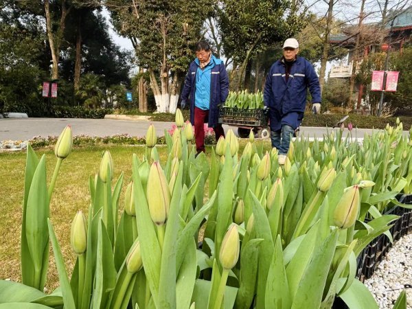 贺岁郁金香花展正在布展。