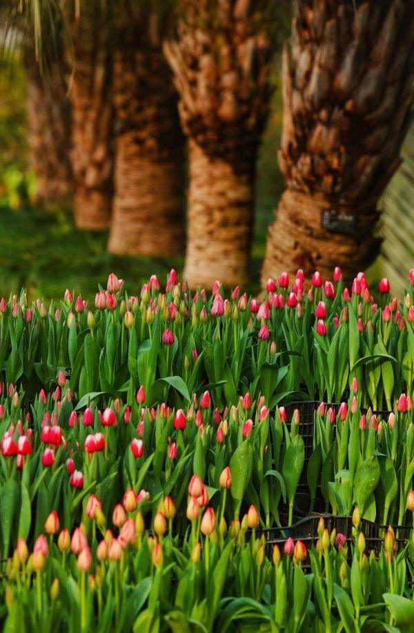 这些郁金香被布置在武汉植物园中心花坛、景观温室门口及园区主干道两侧。大部分含苞待放,少量花朵初绽,预计春节前夕进入盛花期。因为是贺岁花卉,这些郁金香以暖色系为主打,包含红、粉、紫、黄、黑、白等6个色系。