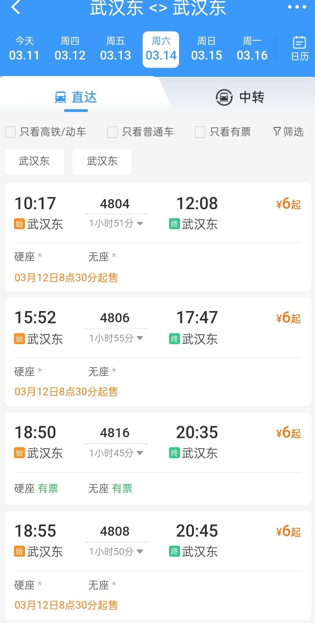 根据售票信息,该普速环线将在3月13日上午8:30开启预订。武汉车站相关负责人透露,目前“武汉东至武汉东”普速环线暂定的运行时间为3月14日至4月2日,主要为了提升旅客出行便捷度,至于后期是否继续运行,将视情况而定。