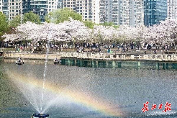 3月28日,西北湖公园的樱花正在盛放,满树繁花如云似雪,在春风里轻轻摇曳。正值周末,为迎接广大市民游客,湖边的喷泉也已开启。水柱凌空而起,水花在阳光下晶莹剔透,恰好映出一道绚丽彩虹,横跨湖面。樱花粉白、湖水清澈、彩虹斑斓,三者同框,构成了春日里最治愈、最浪漫的画面。
