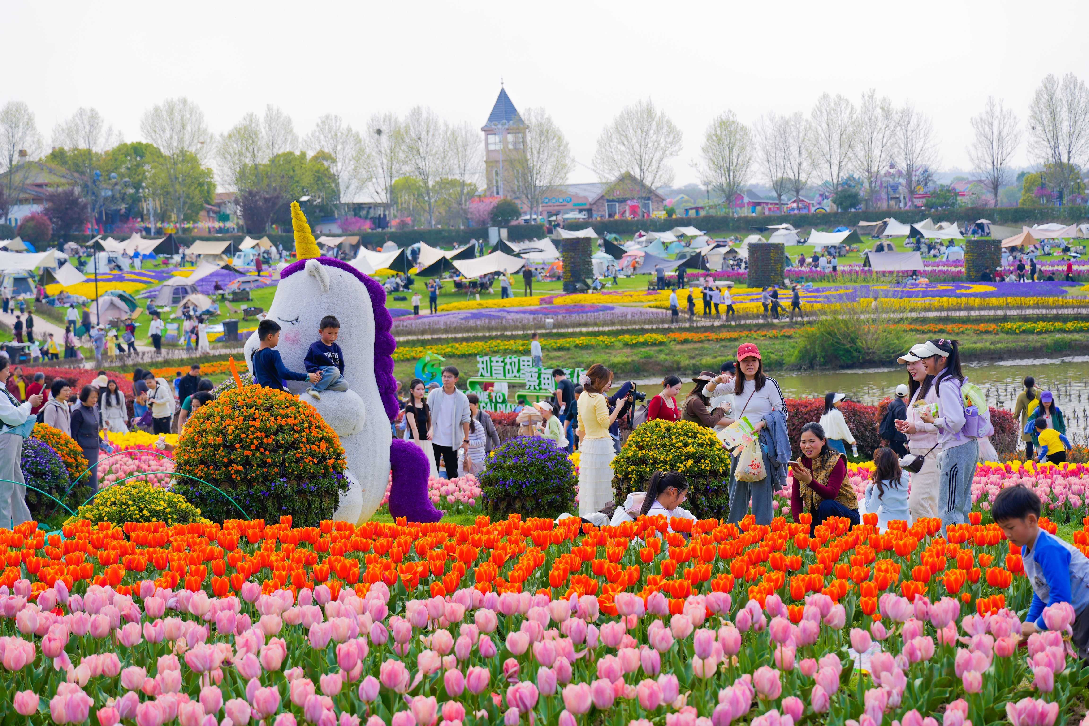 郁金香、虞美人、二月兰等千亩花海花开灿烂,全景实景史诗大剧《盛世楚歌》首演,《十二花神令》沉浸式互动节目、乐队表演、魔法秀、戏剧等演艺上新。4日当天,花博汇景区吸引近两万游客前来踏青赏花。