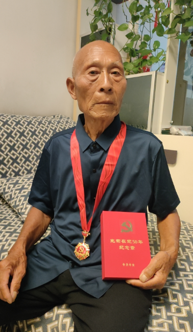 图为陈有银领取“光荣在党50年”纪念章拍照留念。
