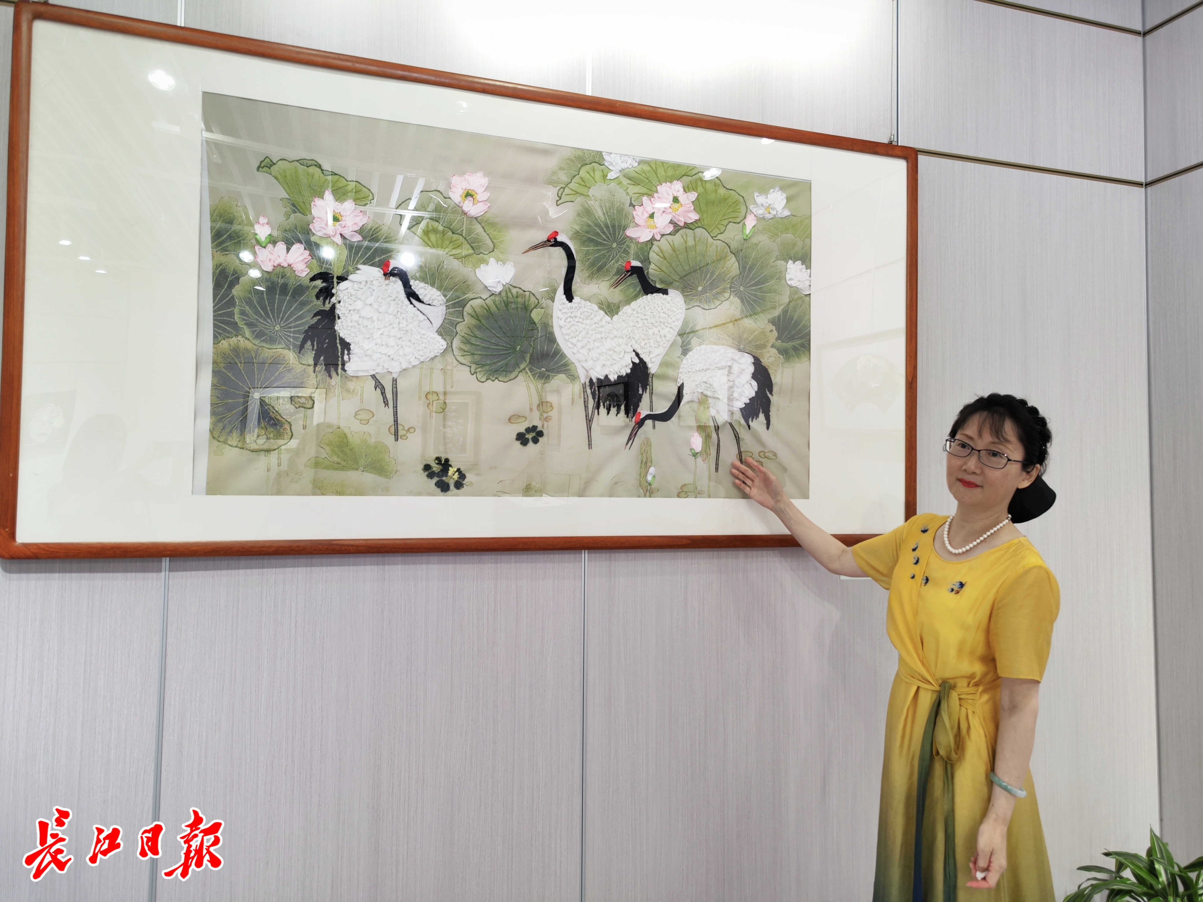 《瑞鹤呈祥》的创作者陈晖是武汉纺织大学退休教师,这幅宽1.5米、高1米的丝带绣巨制承载了她六年心血。作品以立体丝带绣工艺呈现四只姿态各异的仙鹤,丝光流转间,鹤羽纤毫毕现,尽显灵动之姿。“仙鹤象征高洁,莲花寓意清廉,这正是我们家的精神追求。”陈晖说。