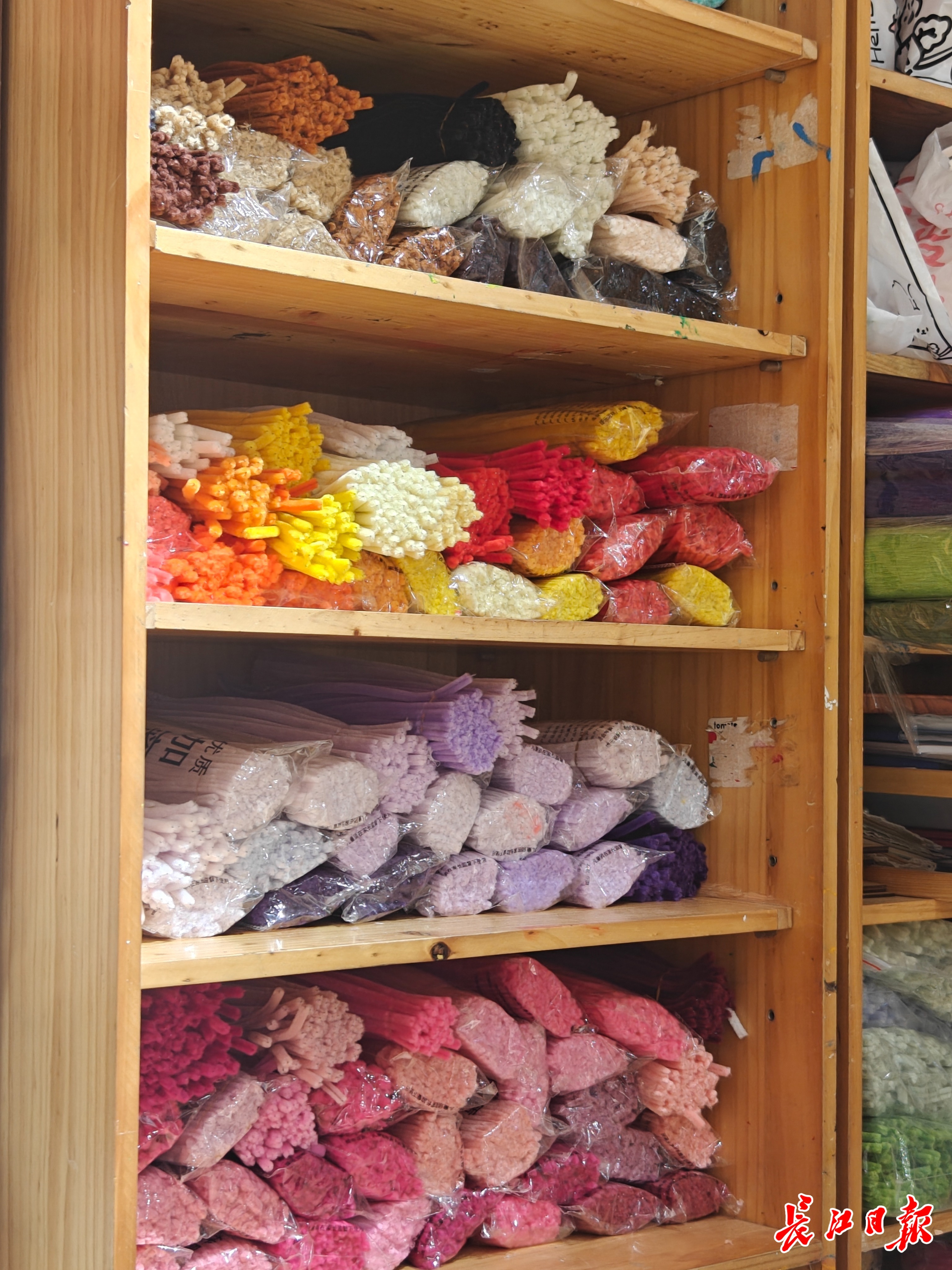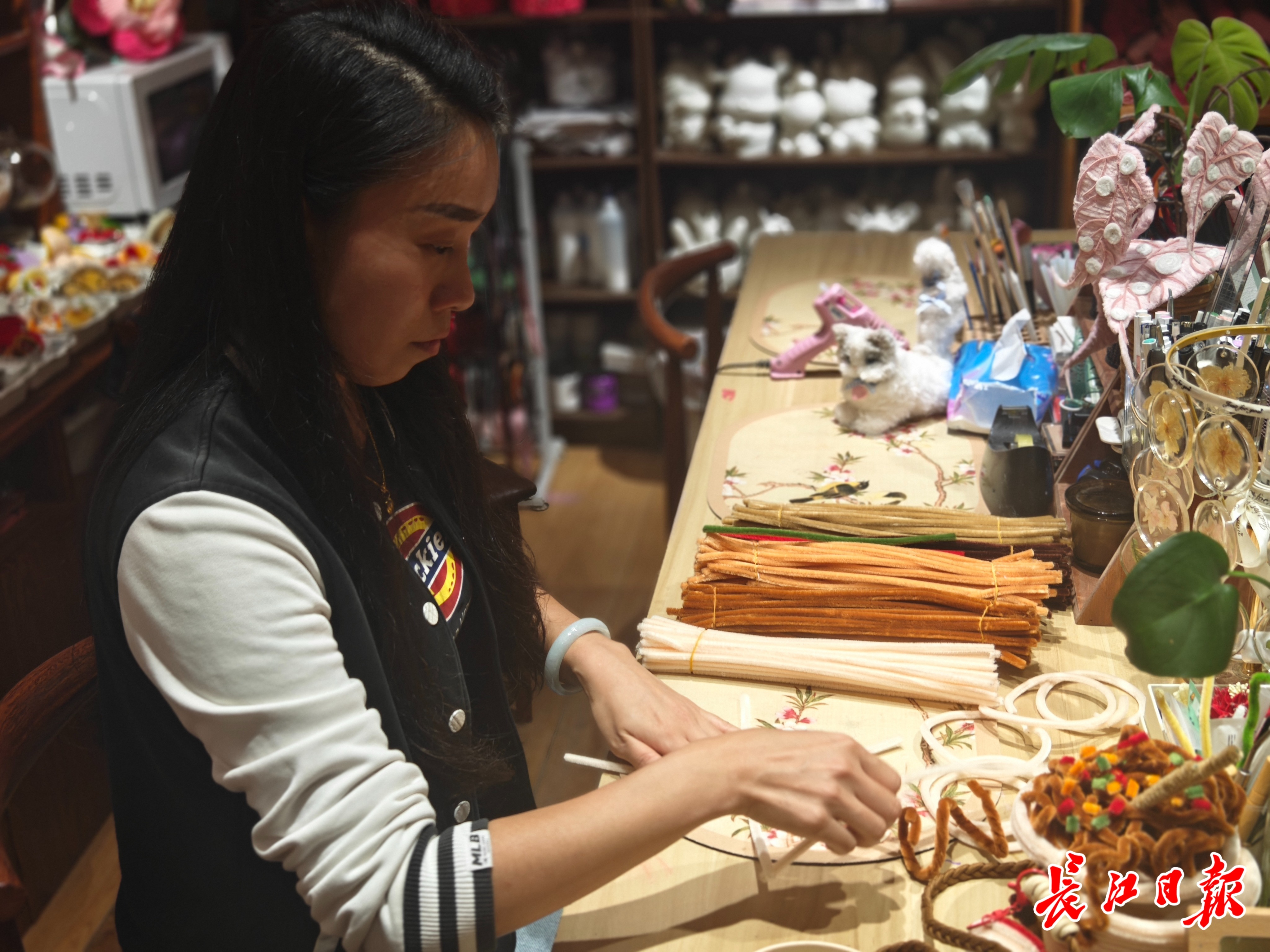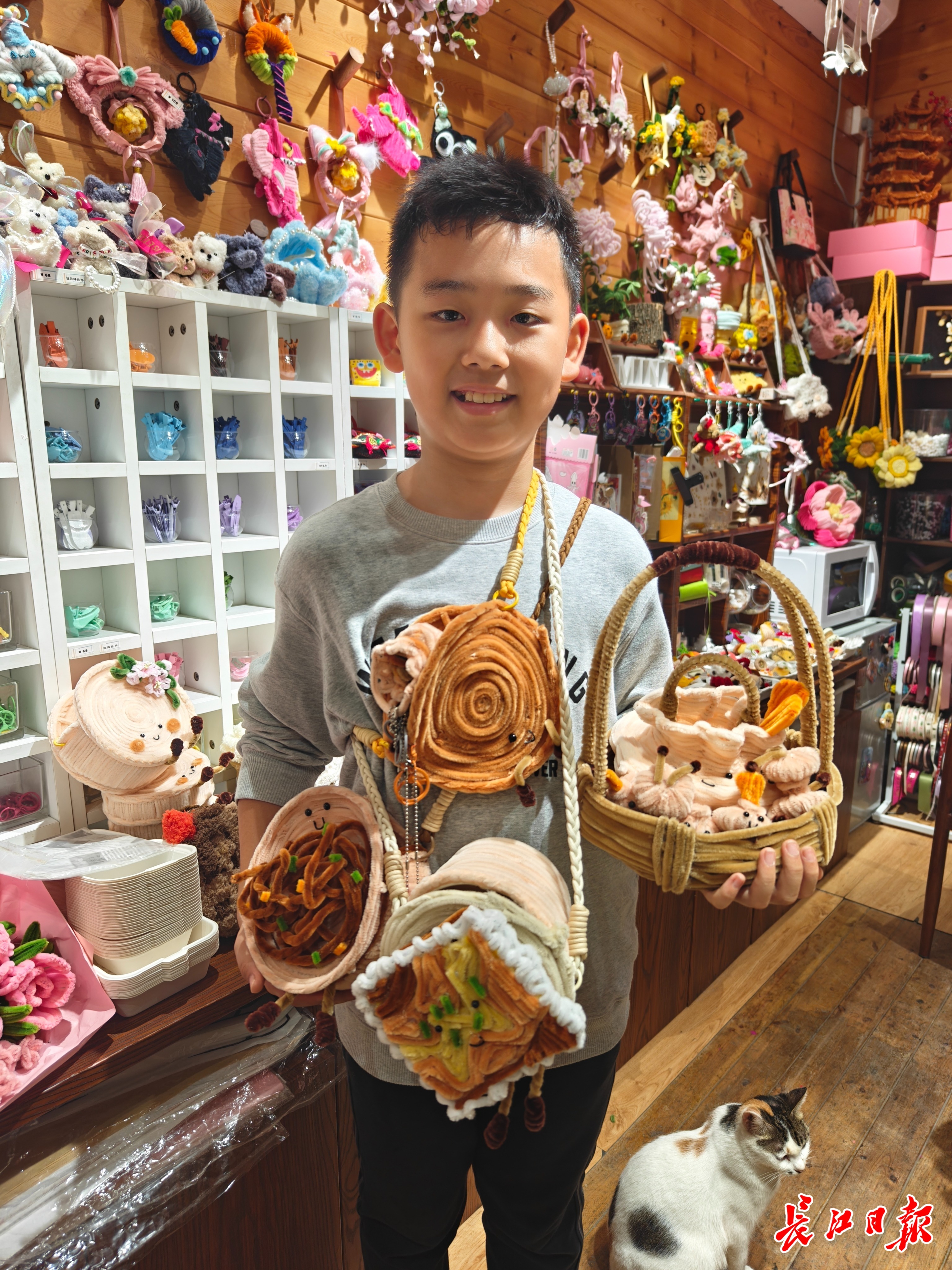 “你看,这其实是个包包!”10月17日下午,在中北路“兔子洞手工坊”里,店主闫佳拿起一个热干面挎包向长江日报记者展示。咖啡色扭扭棒缠绕成“面条”,像裹着浓郁的芝麻酱,上面还点缀着“葱花”“辣椒”和“萝卜丁”。包身上长着豆豆眼和小短脚,模样逗趣。
